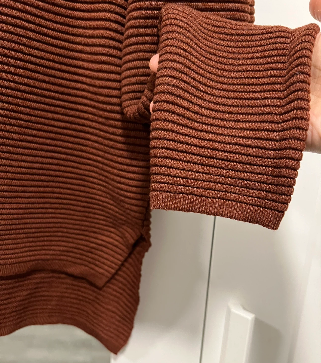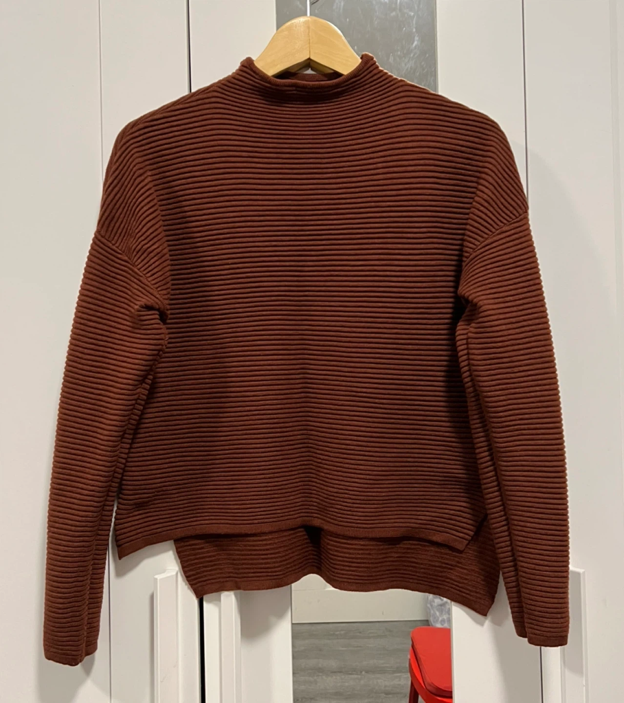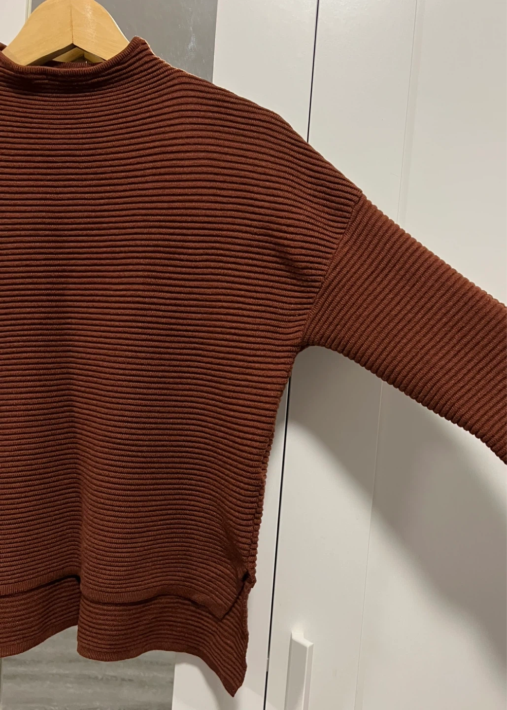 Ribbed knit sweater from Dynamite in maroon. Has a boxy fit bc of the drop shoulder and also has a mock neck type of neckline. Runs a bit small so would fit size small better in my opinion.
