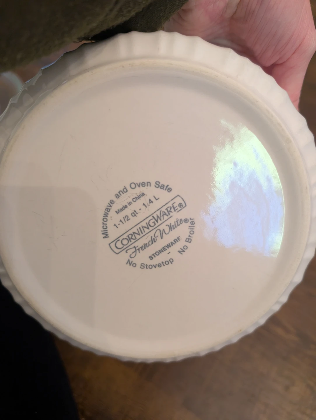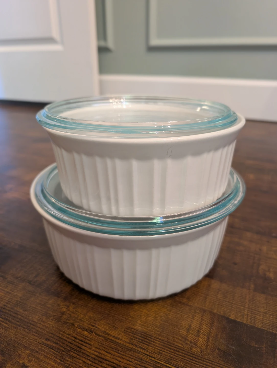 Two white stoneware ramekins with glass lids. One holds 1-1/2 qt - 1.4 L. The other one is bigger. They're microwave and oven safe. Great for baking or serving individual portions!