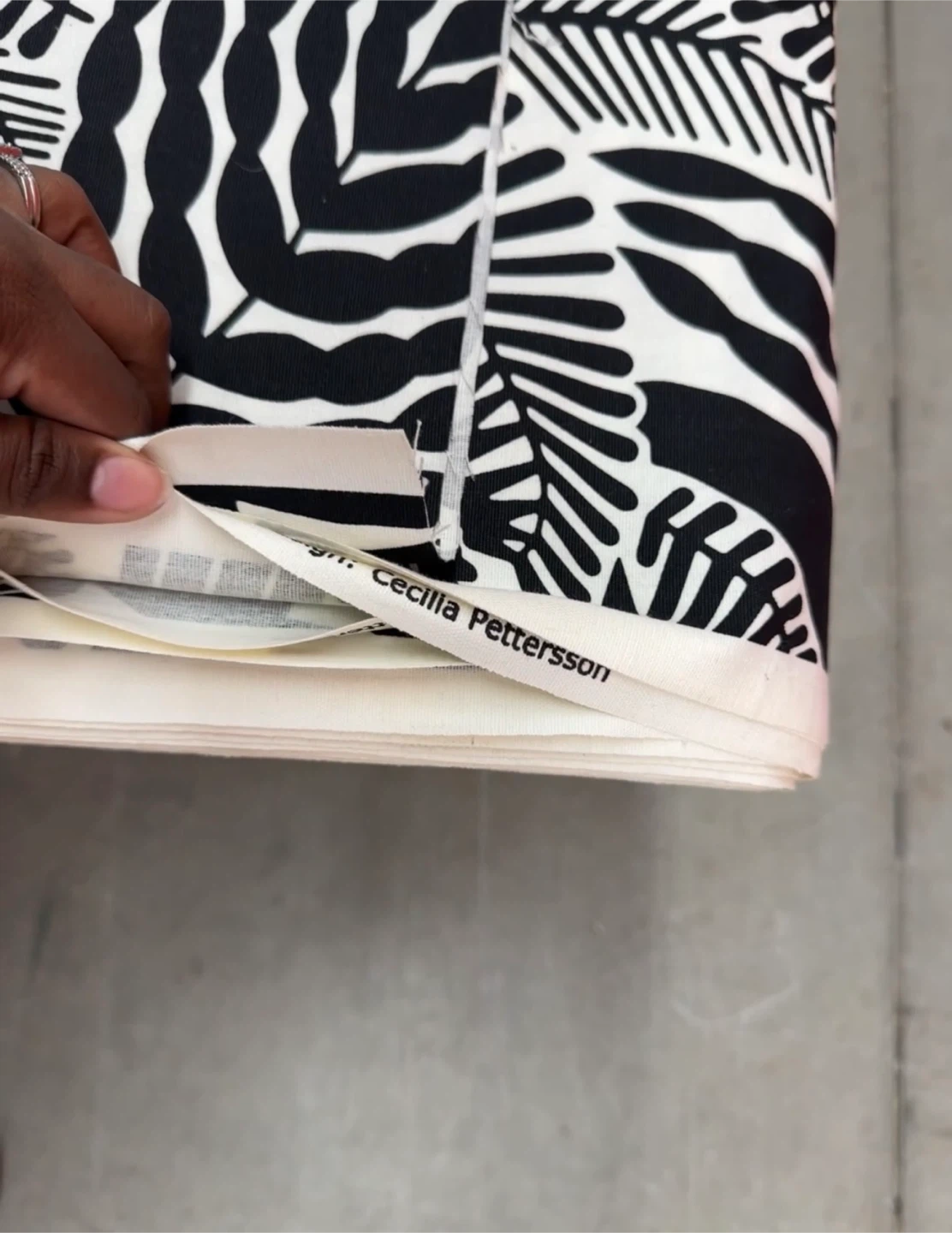 Fabric with a bold black and white leaf print. Perfect for upholstery or crafting projects!