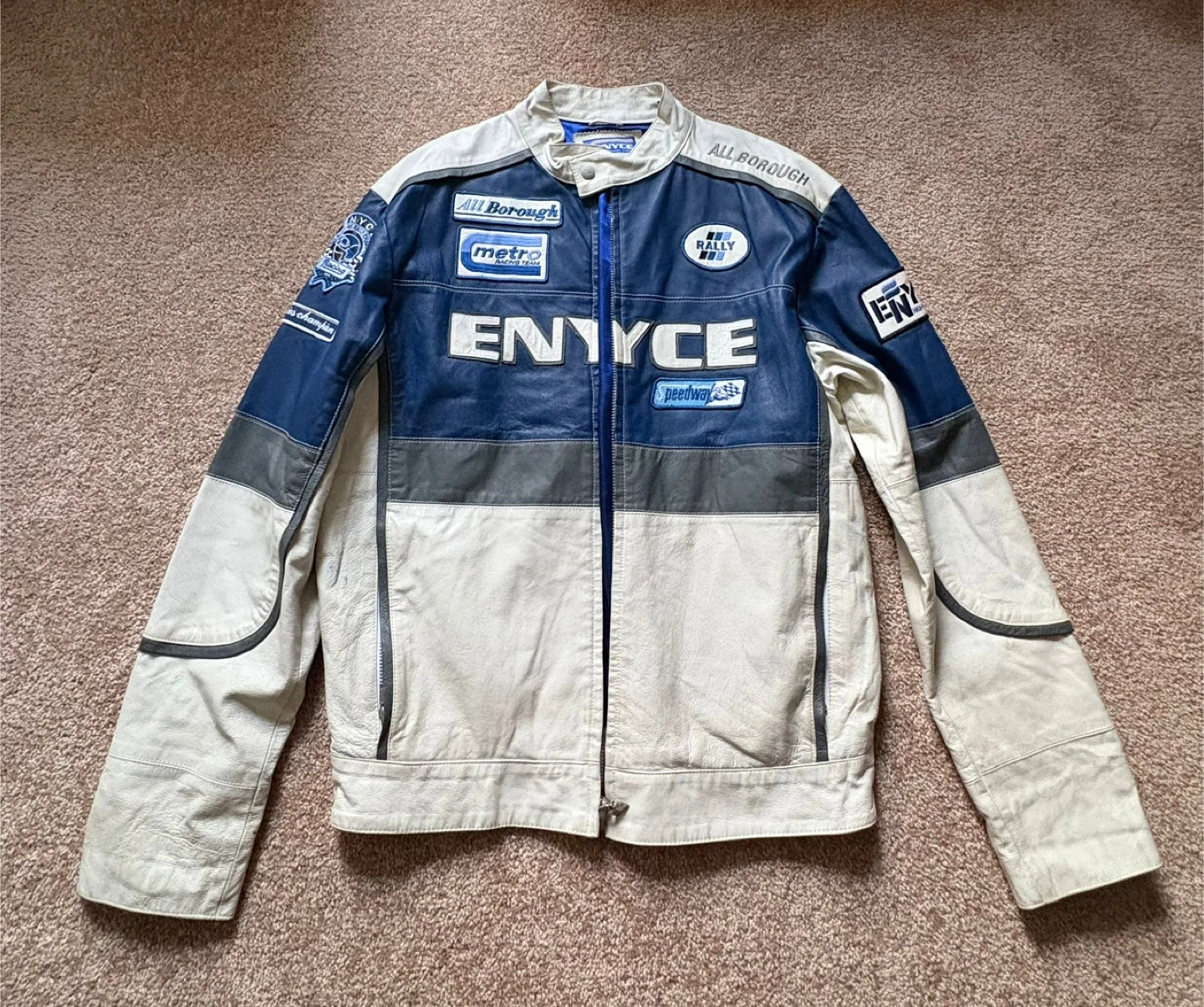 Selling a cool ENYCE leather jacket with a racing style design! The jacket features a mix of blue, grey, and white colours, with various patches and logos. It's a unique piece that would be a great addition to any wardrobe.