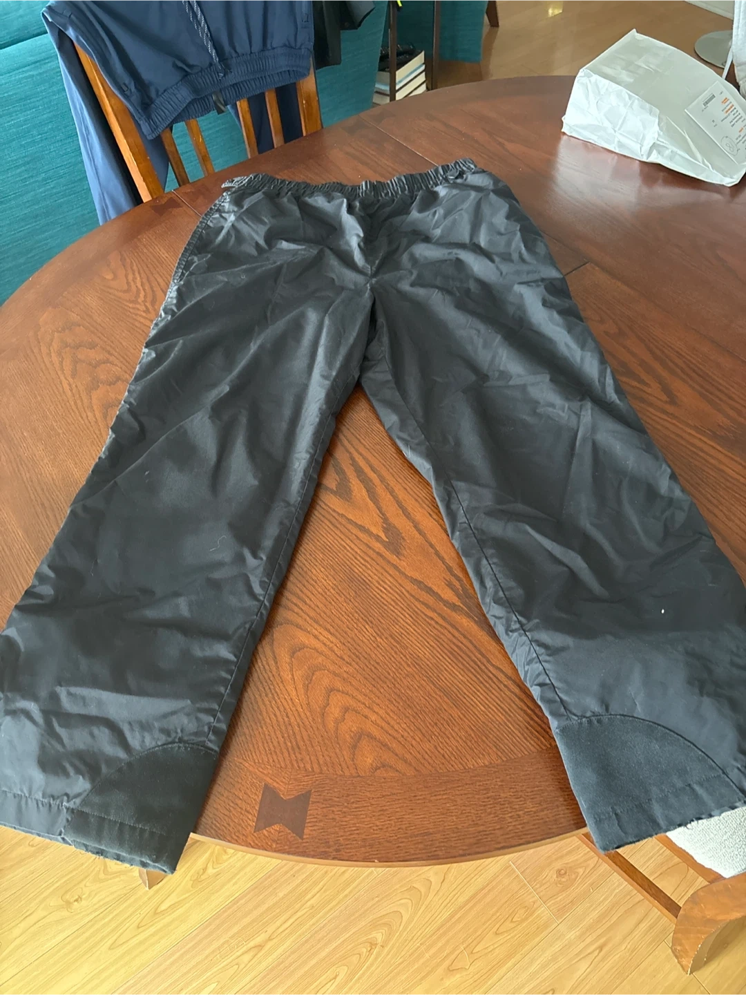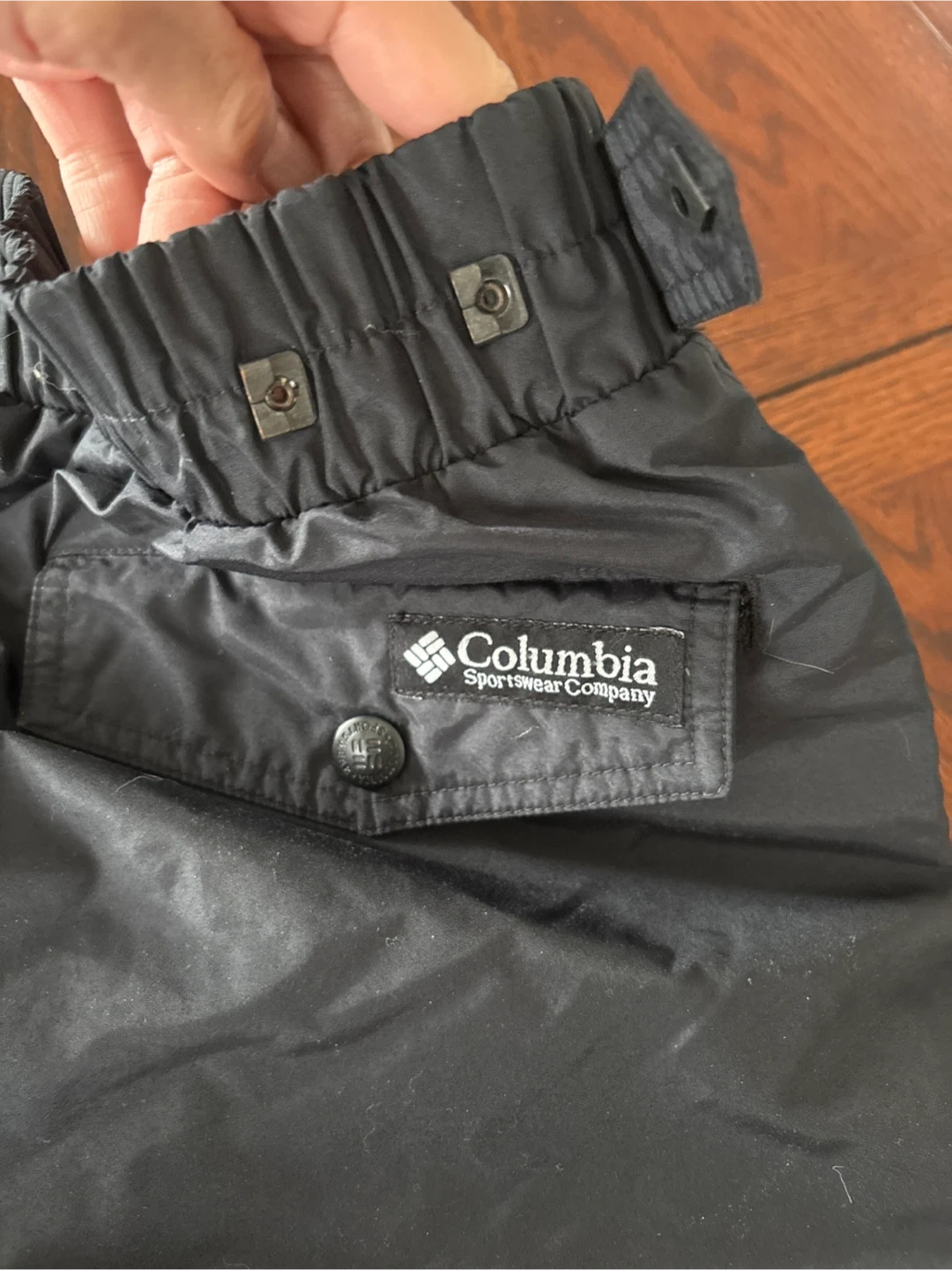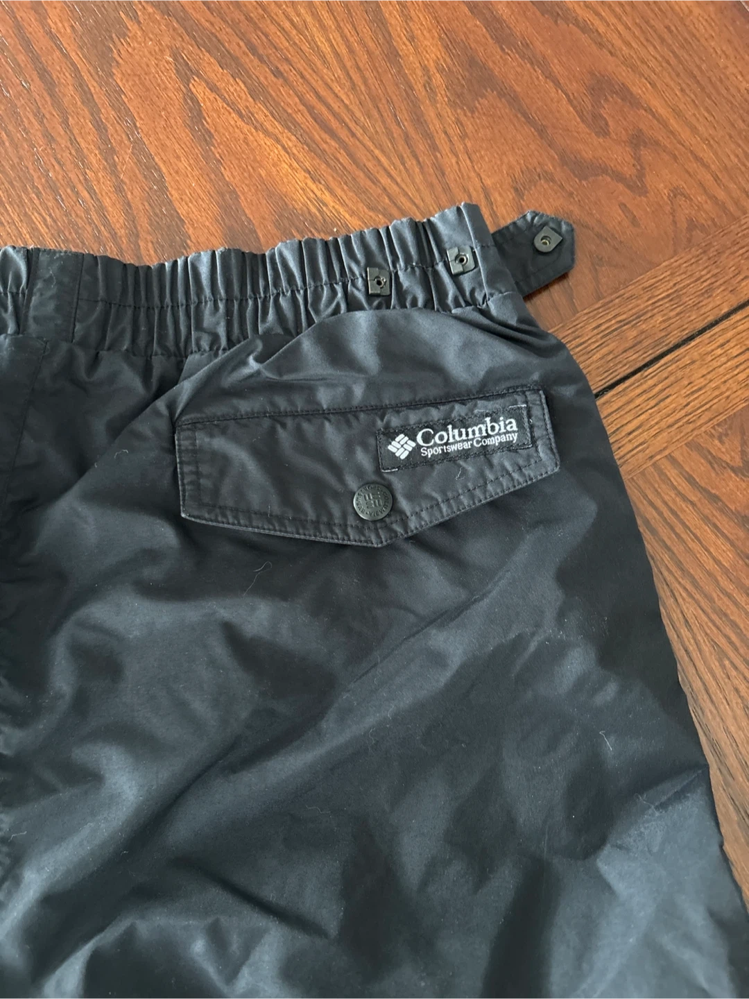 These Columbia Sportswear pants are black and men's size large. They feature an elastic waistband with snaps at the back and a zippered pocket on the back. Built for comfort and durability!