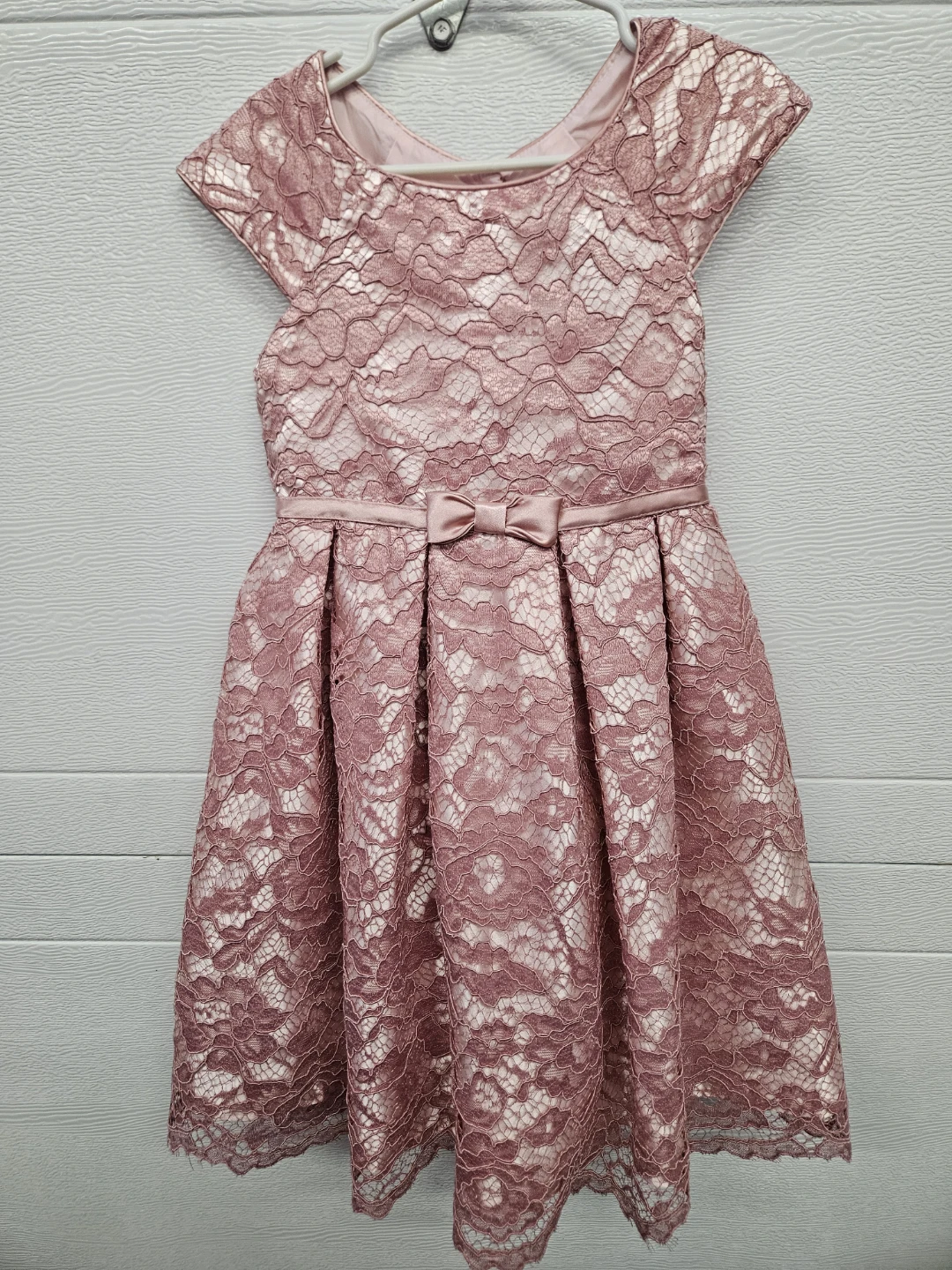 This Lona Michelle girls' dress is a beautiful pink lace design. It's a size 5 and features a satin sash with a bow. The lining is 100% polyester.
