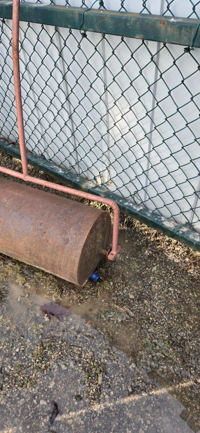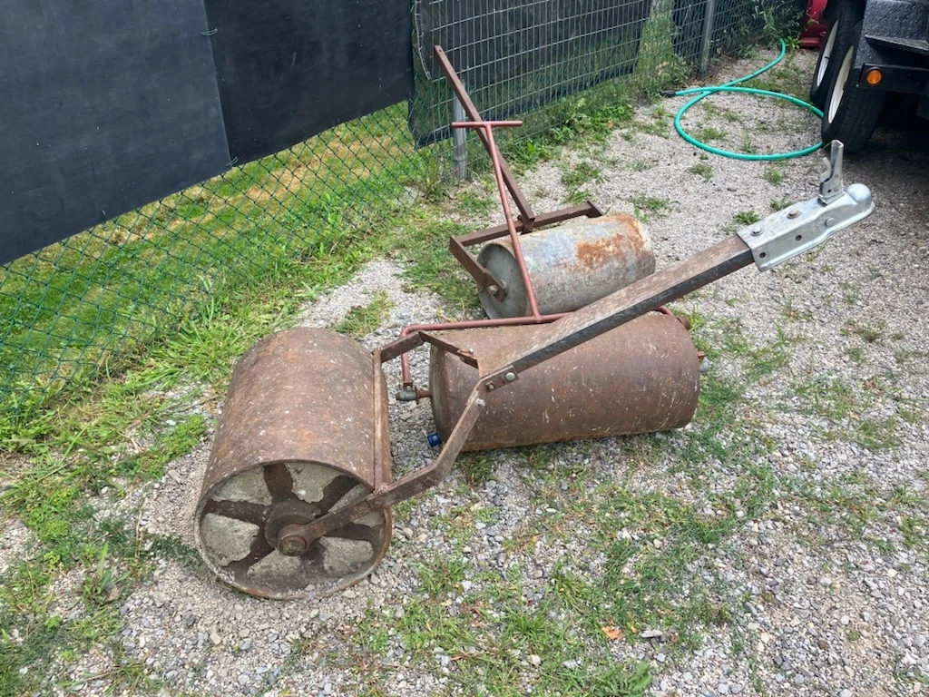 lawn roller. It's a metal drum that can be filled with water or sand for added weight.