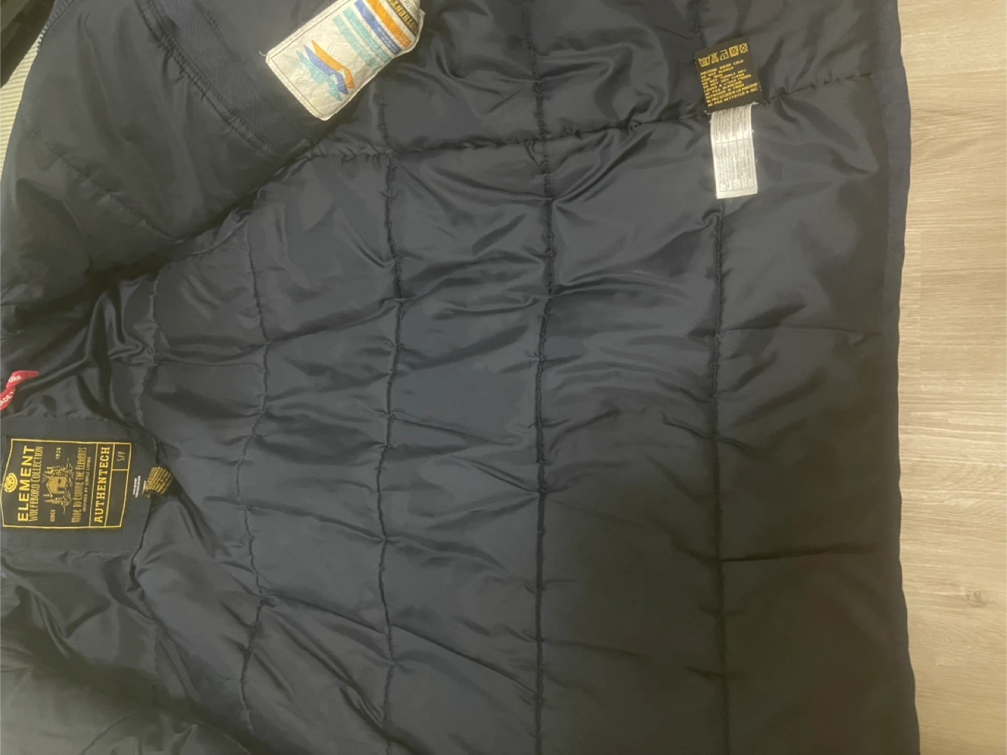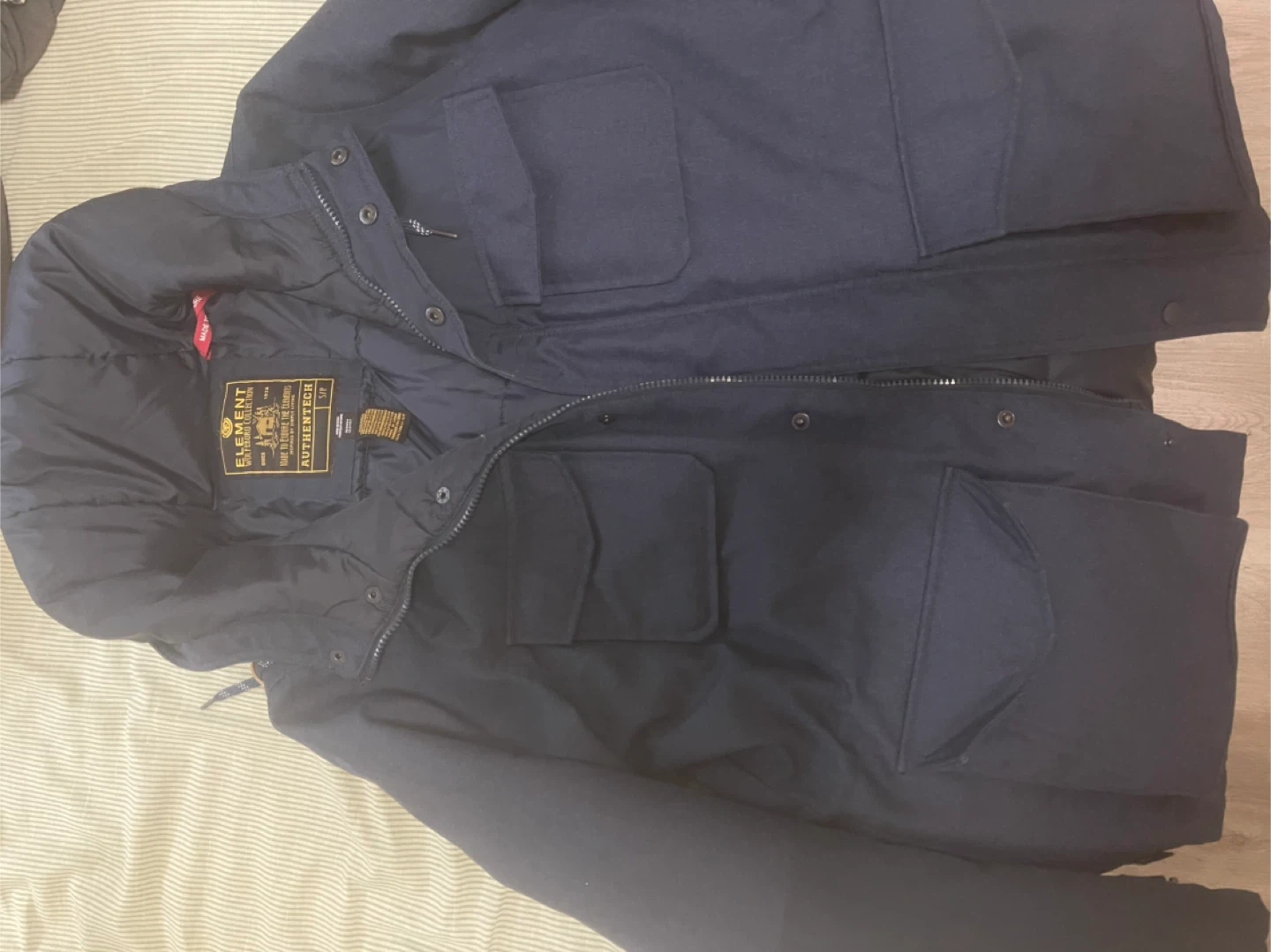 Element hooded jacket in navy blue. It's insulated and features multiple pockets. Made for warmth and durability.
