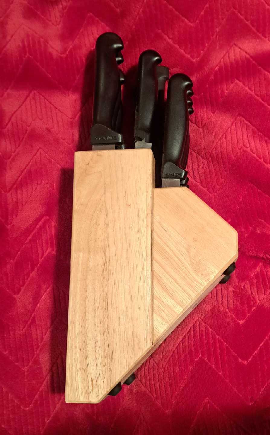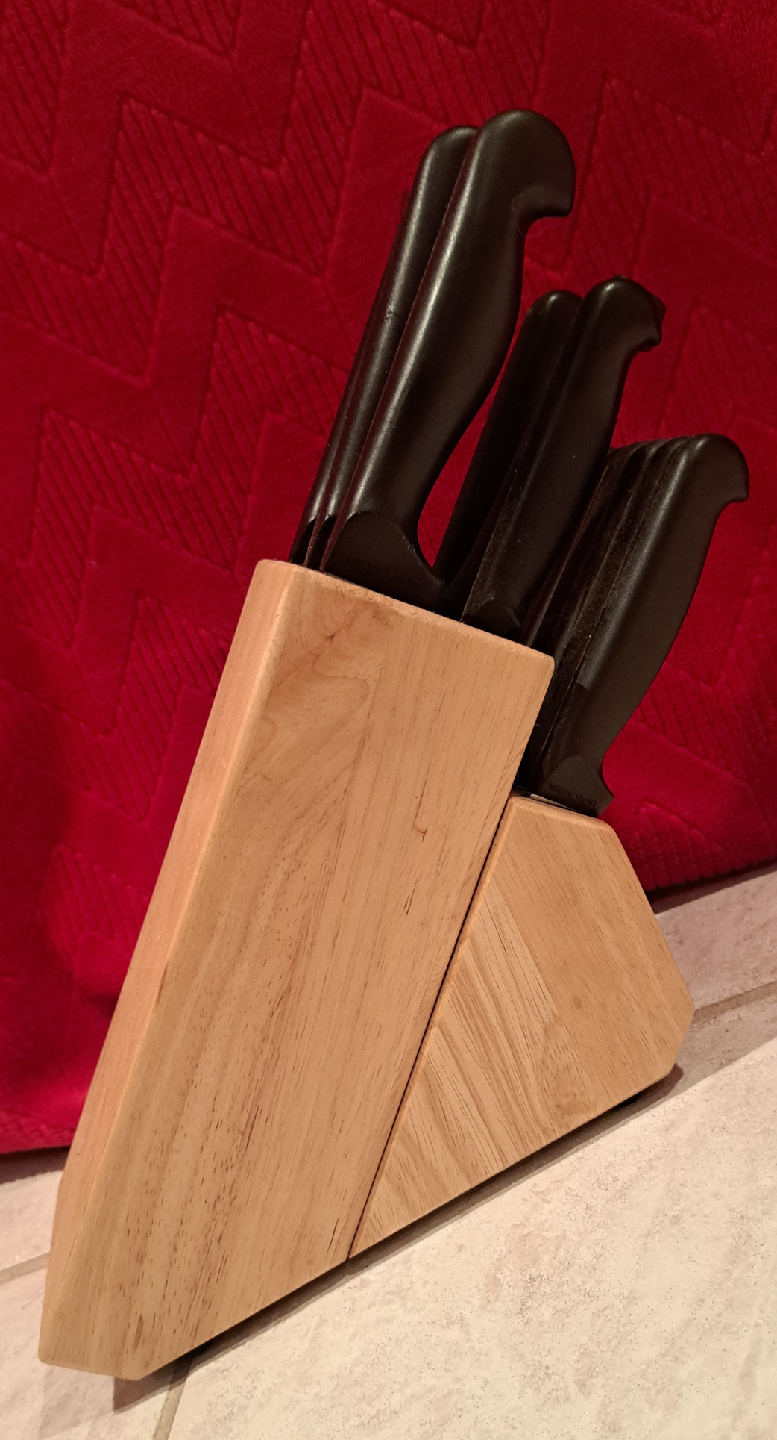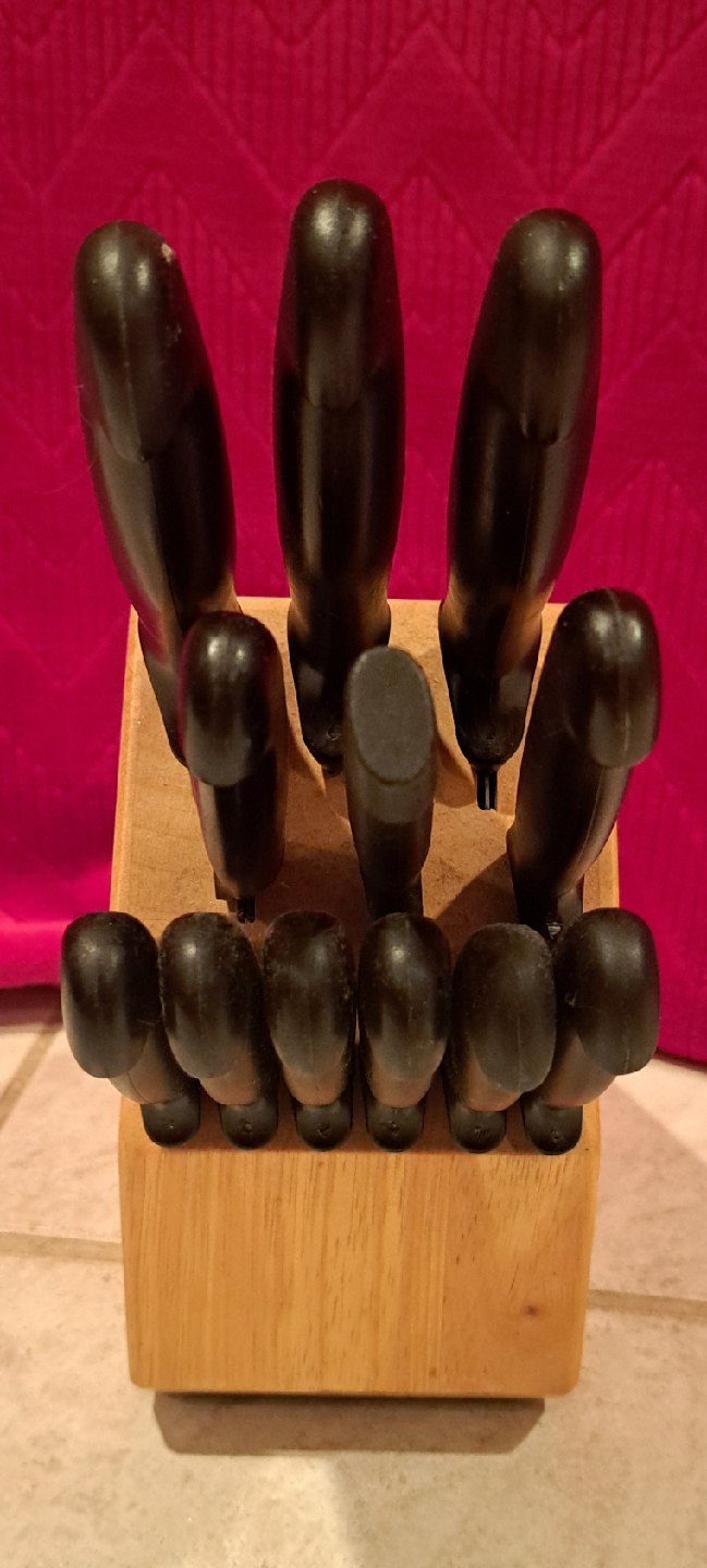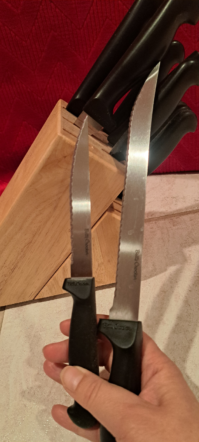 Selling a Betty Crocker knife set, complete with a wooden block! The knives have black handles and are in great condition. Never used! Perfect for any kitchen!