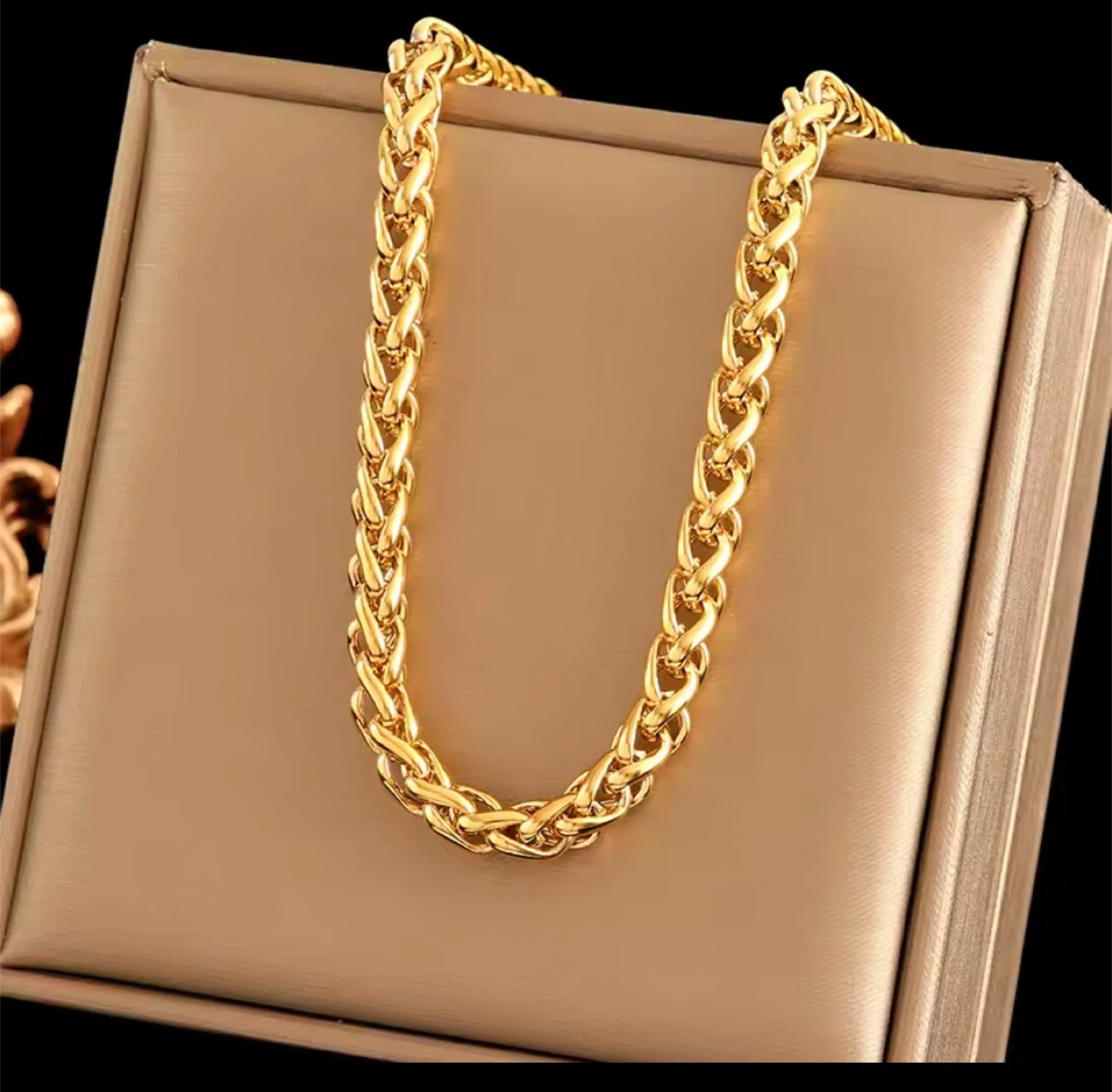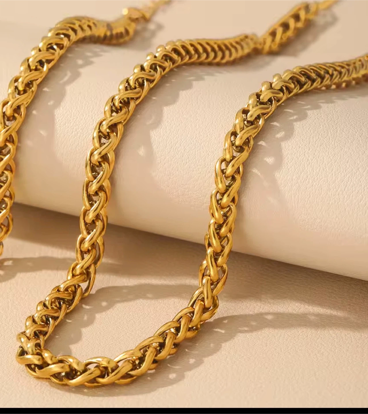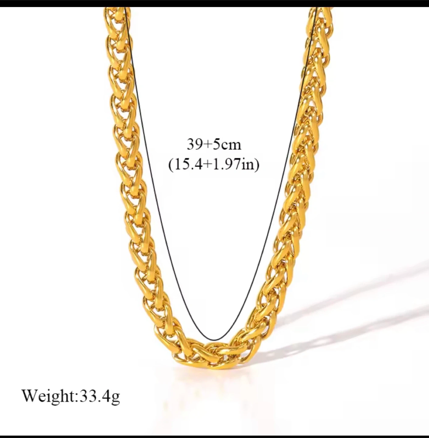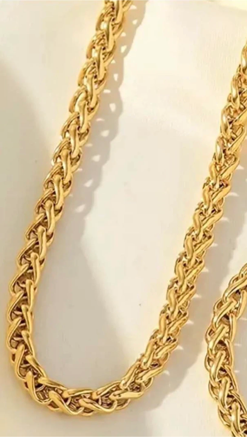 A classic gold tone wheat chain necklace. It's 39+5cm long and weighs 33.4g. This necklace adds a stylish touch to any outfit. Lazurd jewelry is your go‑to statement piece for a luxury look.
