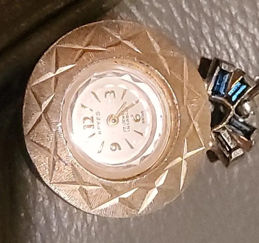 Vintage K FYES watch with a white face and gold-tone casing. It's a 17 jewel, Incabloc movement made in Switzerland. Features a decorative bezel with blue and clear stones.