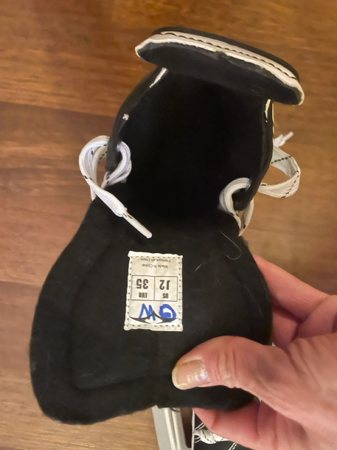 These black and white hockey skates are a youth size 12. They feature a black boot with white laces and red accents. The brand label inside the skate shows it's a GC model.