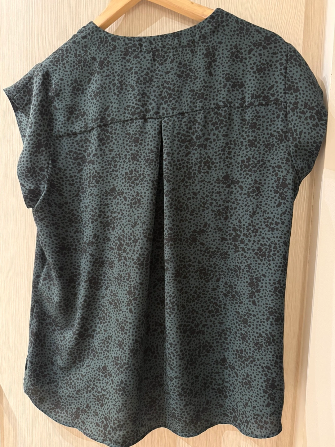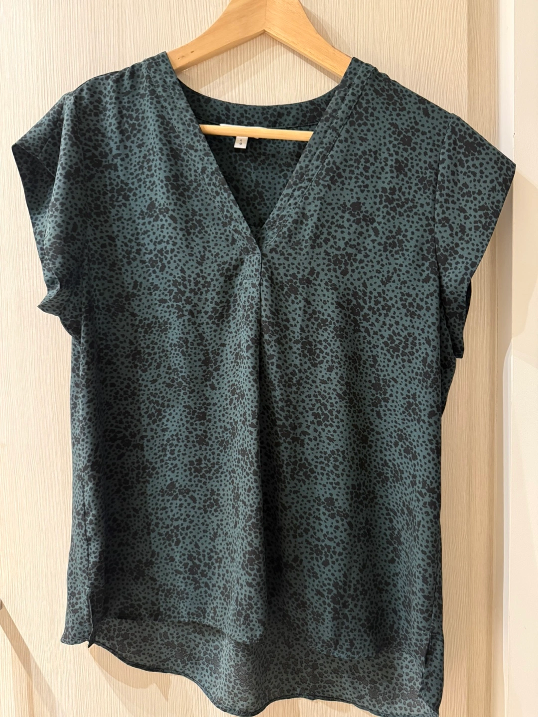 A cute leopard-patterned blouse in size Large. Perfect for summer, or fall with a cardigan. The blouse features a stylish print on a comfortable material. Great fabric.