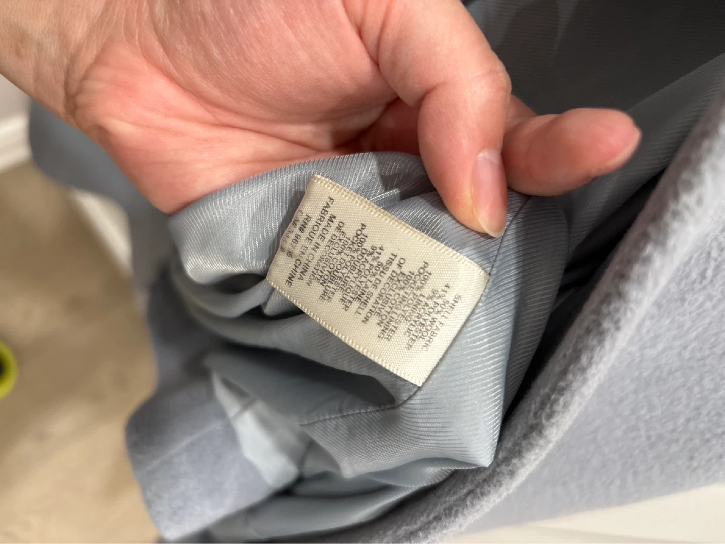 This Rebecca Taylor coat is a light blue colour. It's made of 60% polyester, 38% rayon, and 2% spandex, with a polyester lining. The collar has a decorative chain detail.
