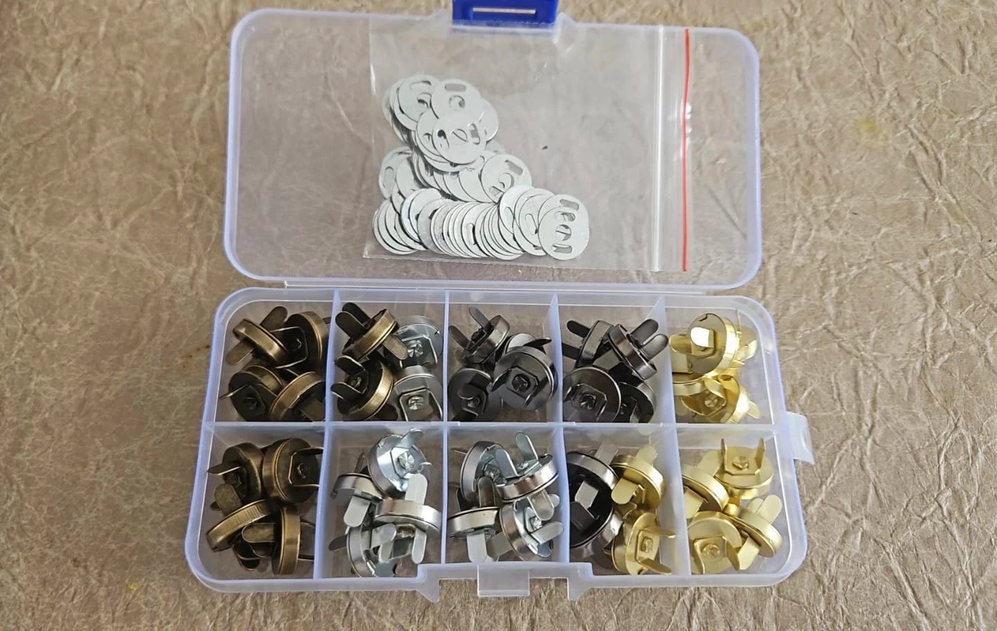 Brand new and never used. If you make tote bags, purses, wallets, or backpacks, these snaps are what you need as the final touch! Available in 4 metal finishes: silver, Grey, bronze, and gold. 40 pieces in total and comes with the storage box.