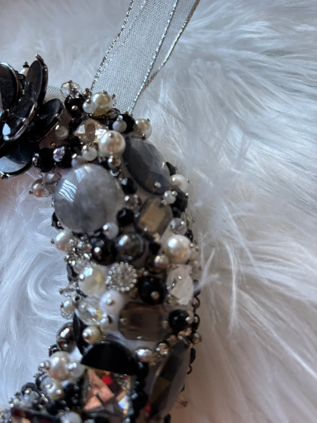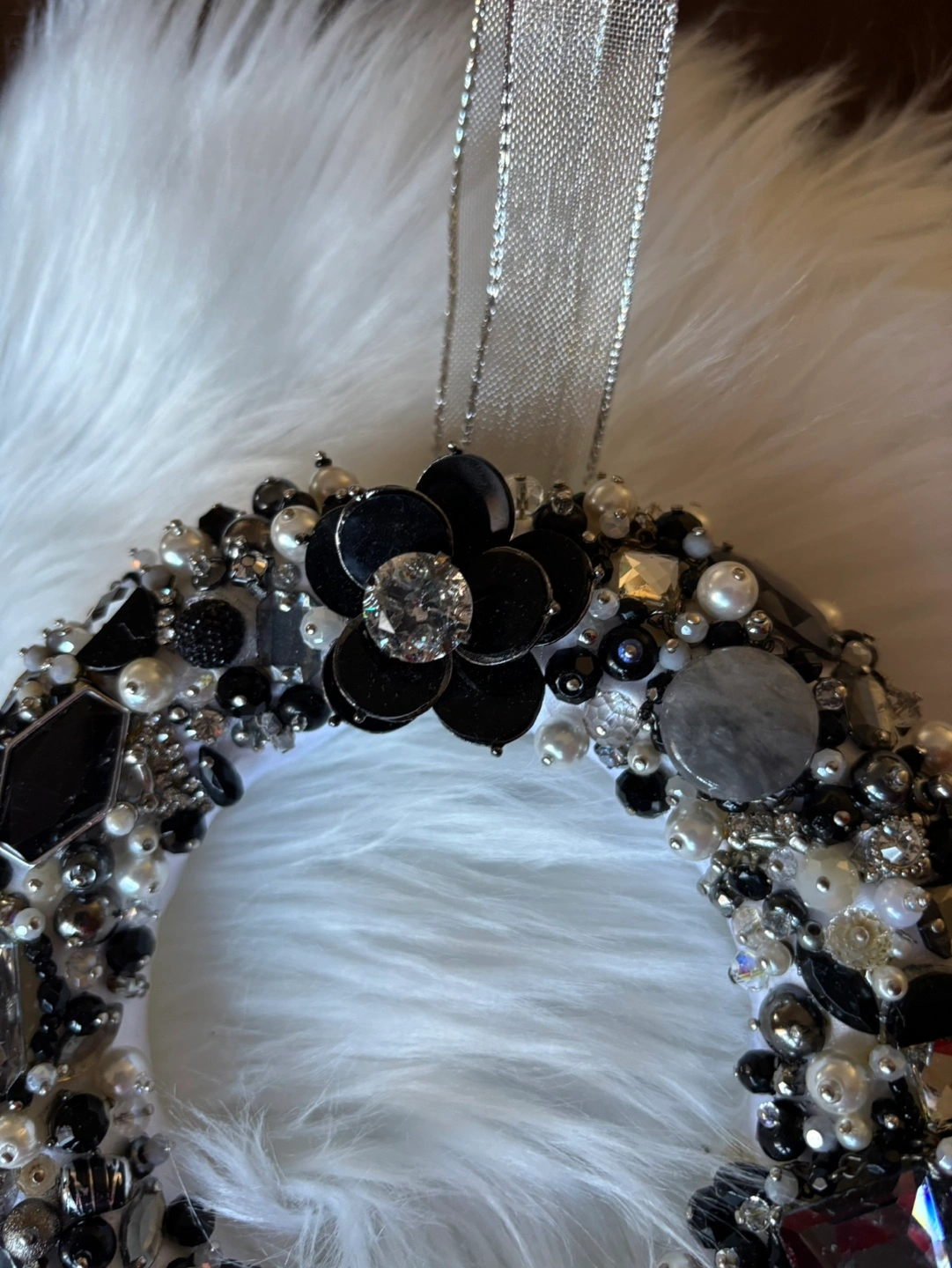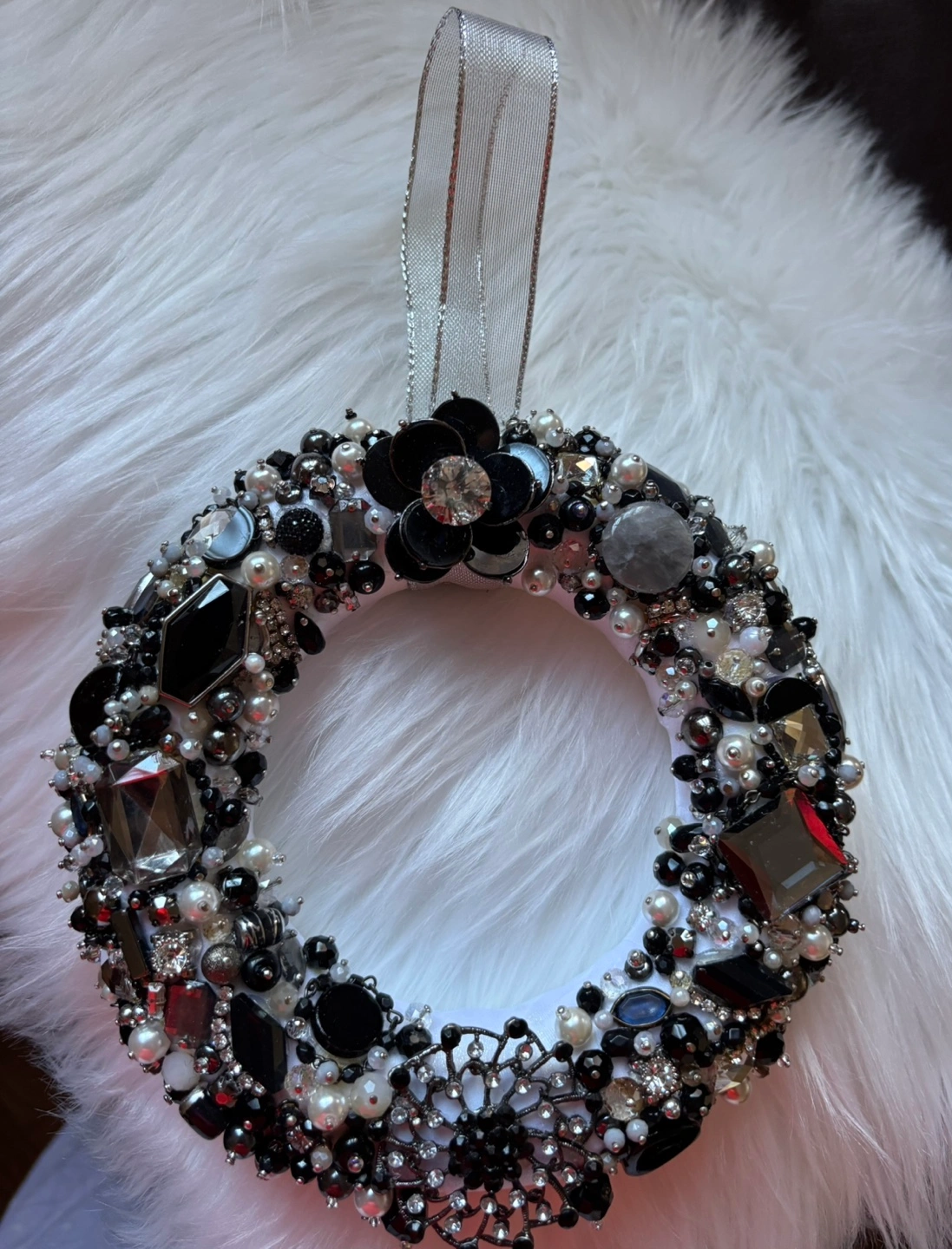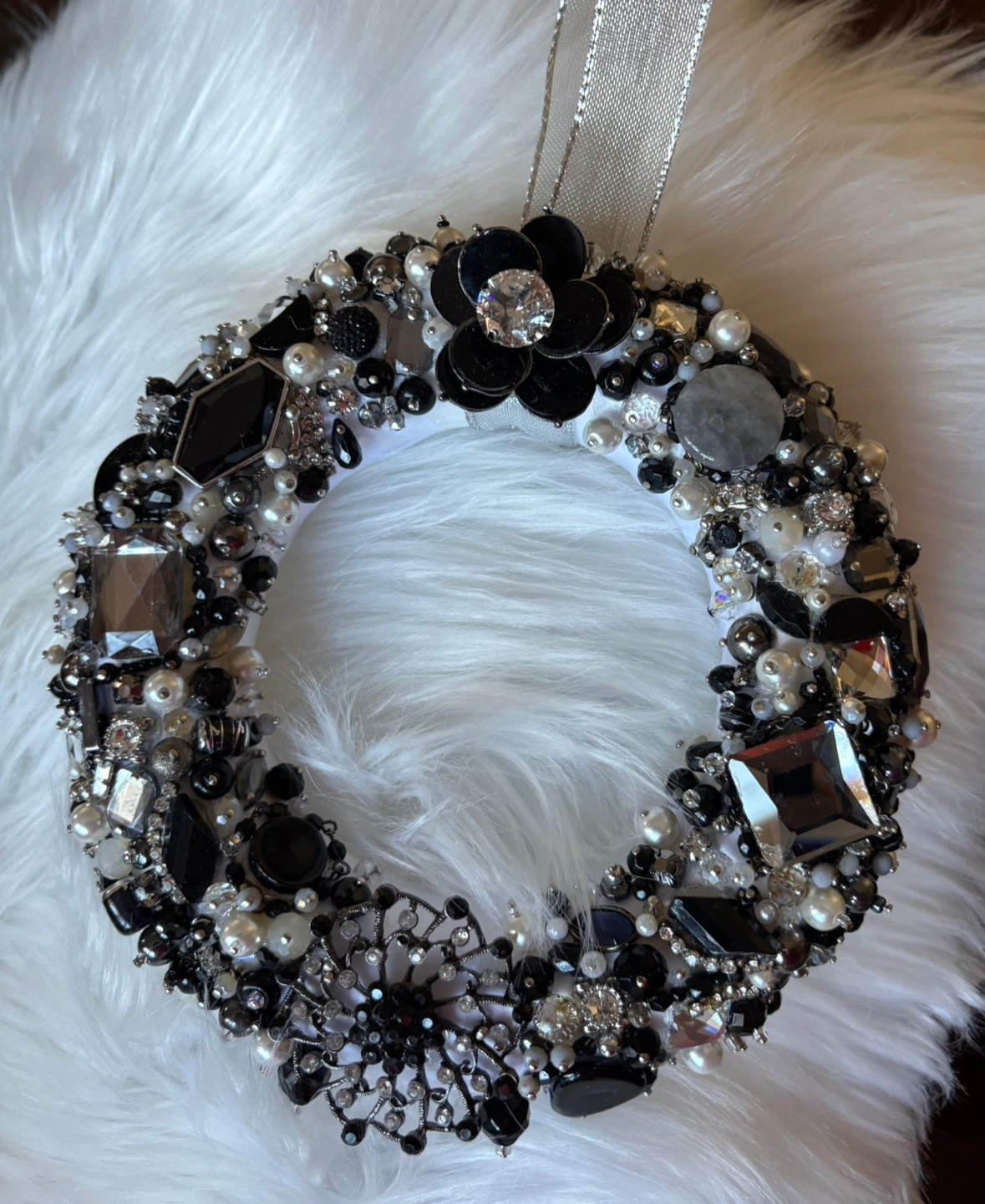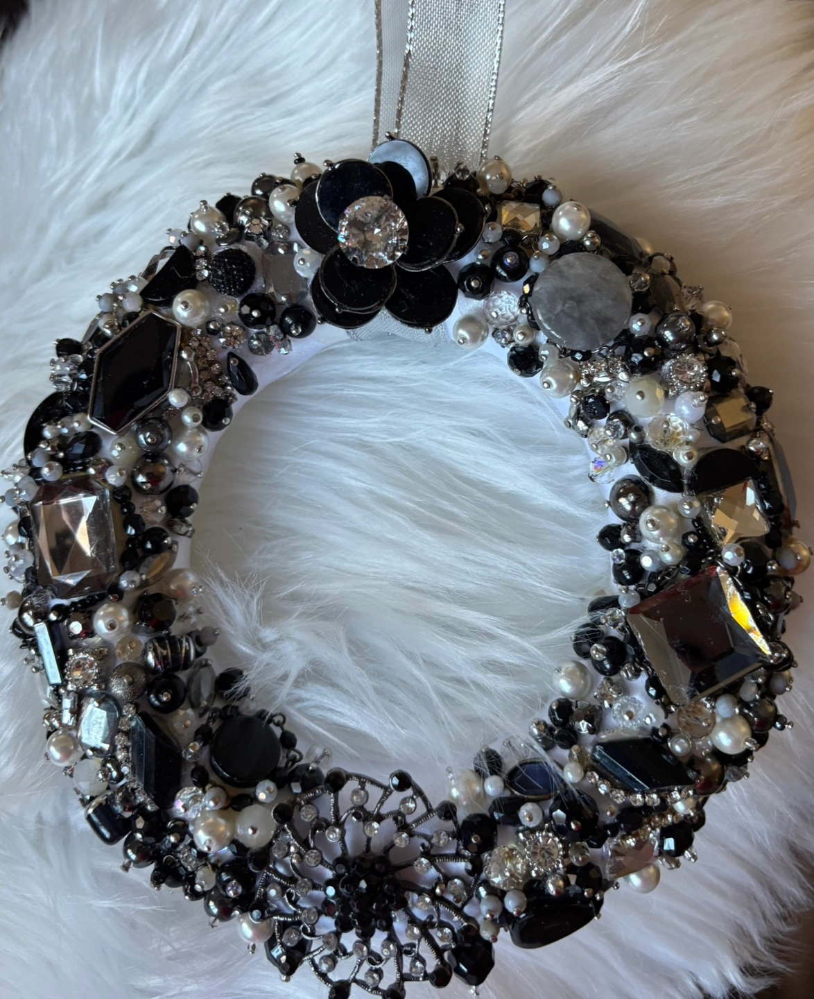 Stunning handmade wreath for wall or door hanging. Features black, grey and white colour jewels, pearls, and rhinestones. Perfect for adding a touch of glamour to your home décor or wedding Includes silver ribbon hanger.