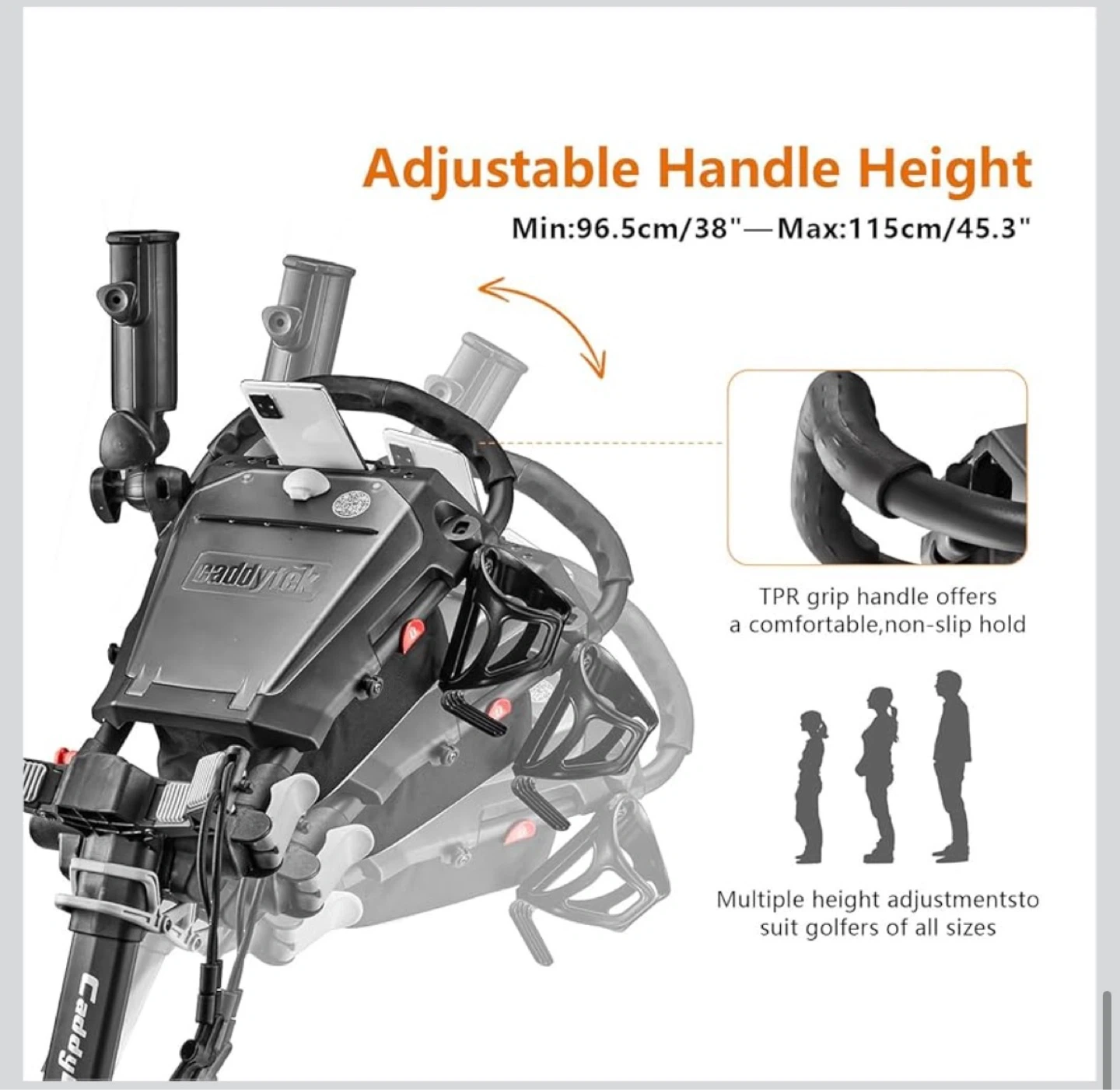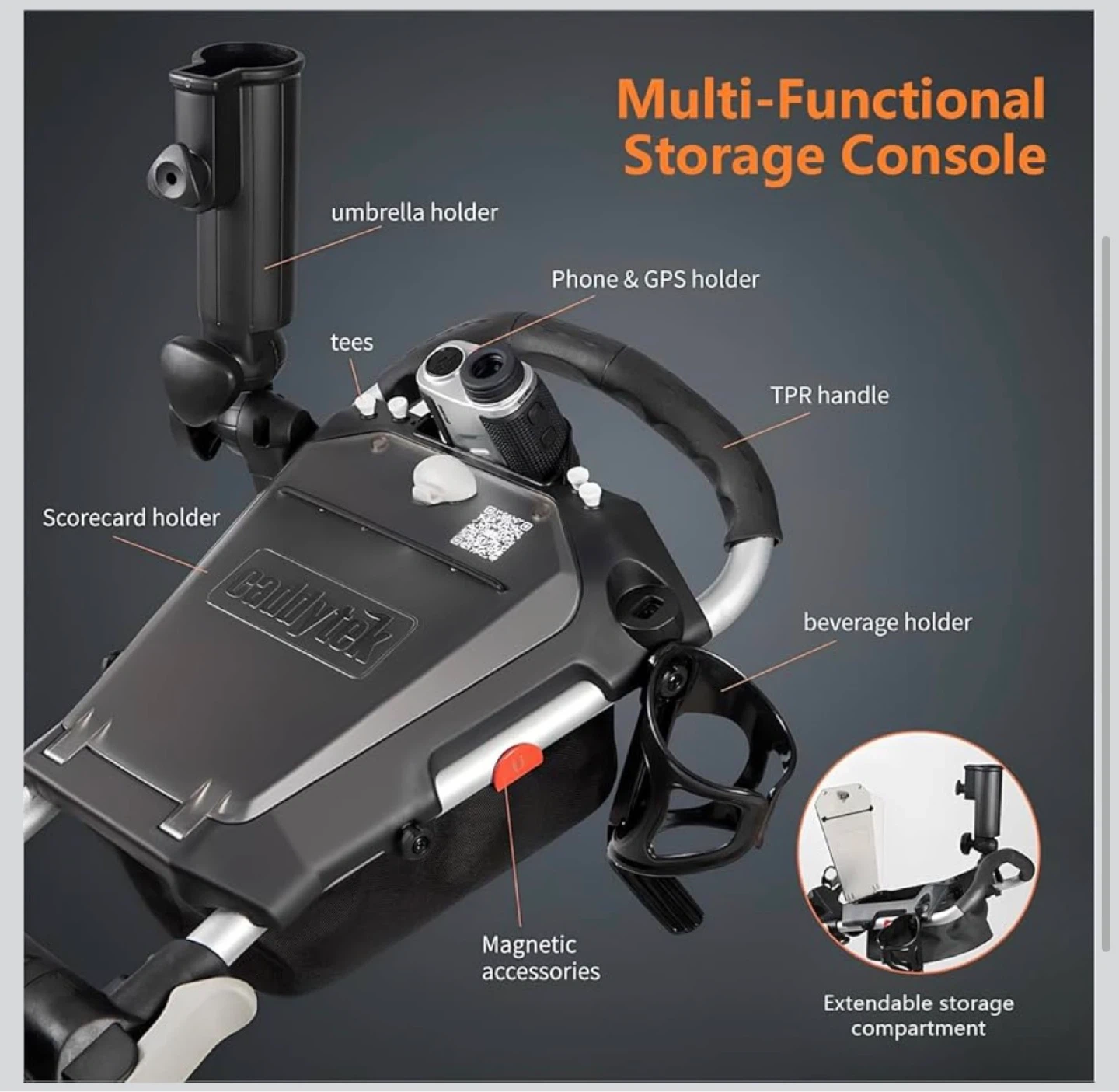 This CaddyTek golf push cart features a swivel front wheel for easy maneuverability. It's a multi-functional storage console with holders for an umbrella, phone, GPS, tees, scorecards, and beverages. The cart offers a folding design that opens or folds with one click and weighs less than 9 kg (20 lbs).