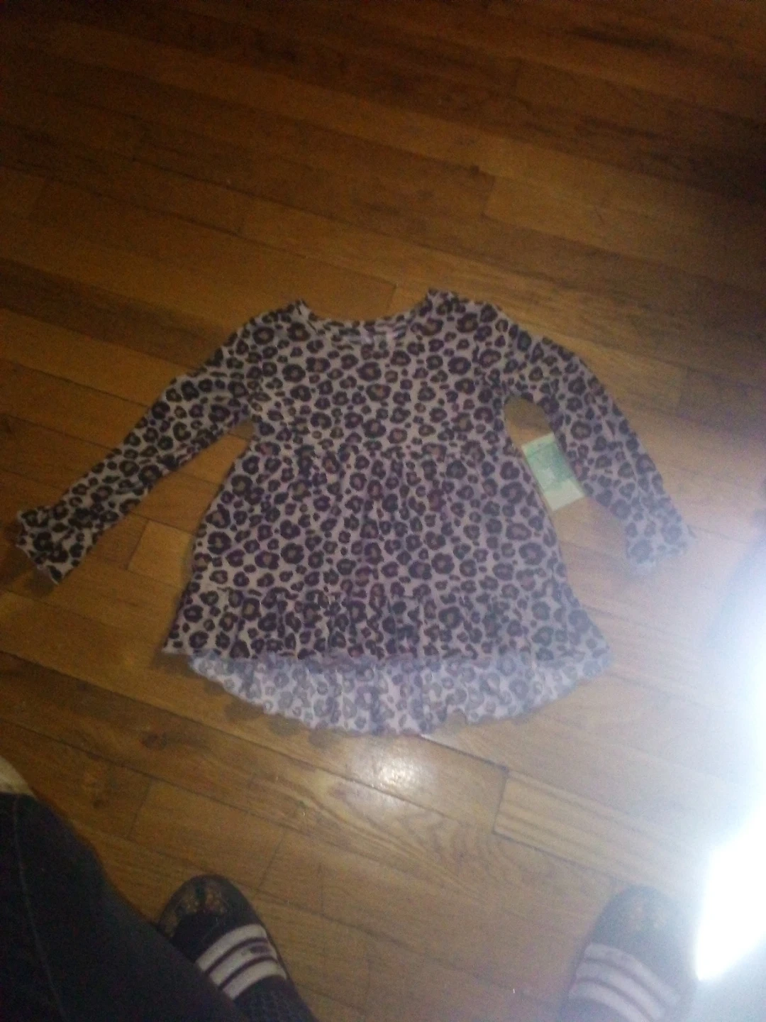 This is a girl's long sleeve dress with a leopard print pattern. It features a ruffled hemline. The material is soft and comfortable for everyday wear.