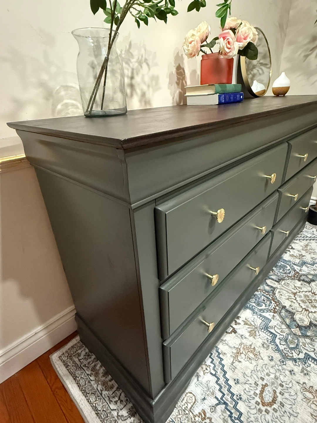 Beautiful solid dresser, fully refinished with care! Painted in high-quality Fusion Mineral Paint Everett and protected with Varathane top coat for durability.