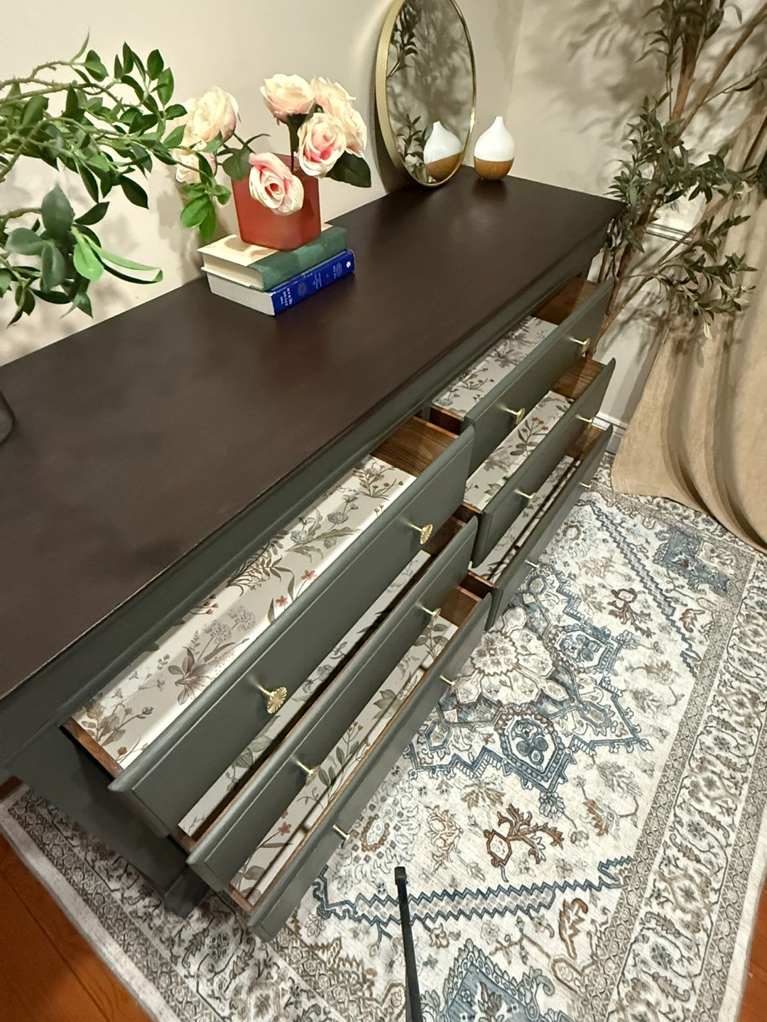 Beautiful solid dresser, fully refinished with care! Painted in high-quality Fusion Mineral Paint Everett and protected with Varathane top coat for durability.