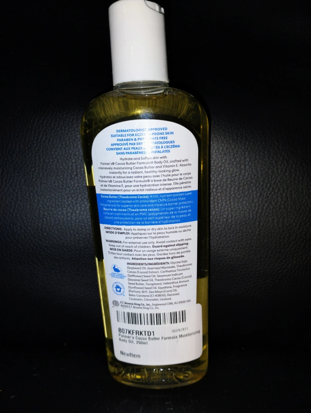 Palmer's Cocoa Butter Formula Moisturizing Body Oil. It's formulated with Cocoa Butter and Vitamin E to moisturize and soften skin. 48H moisture hydration. Dermatologist approved.