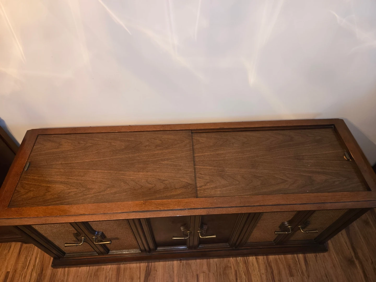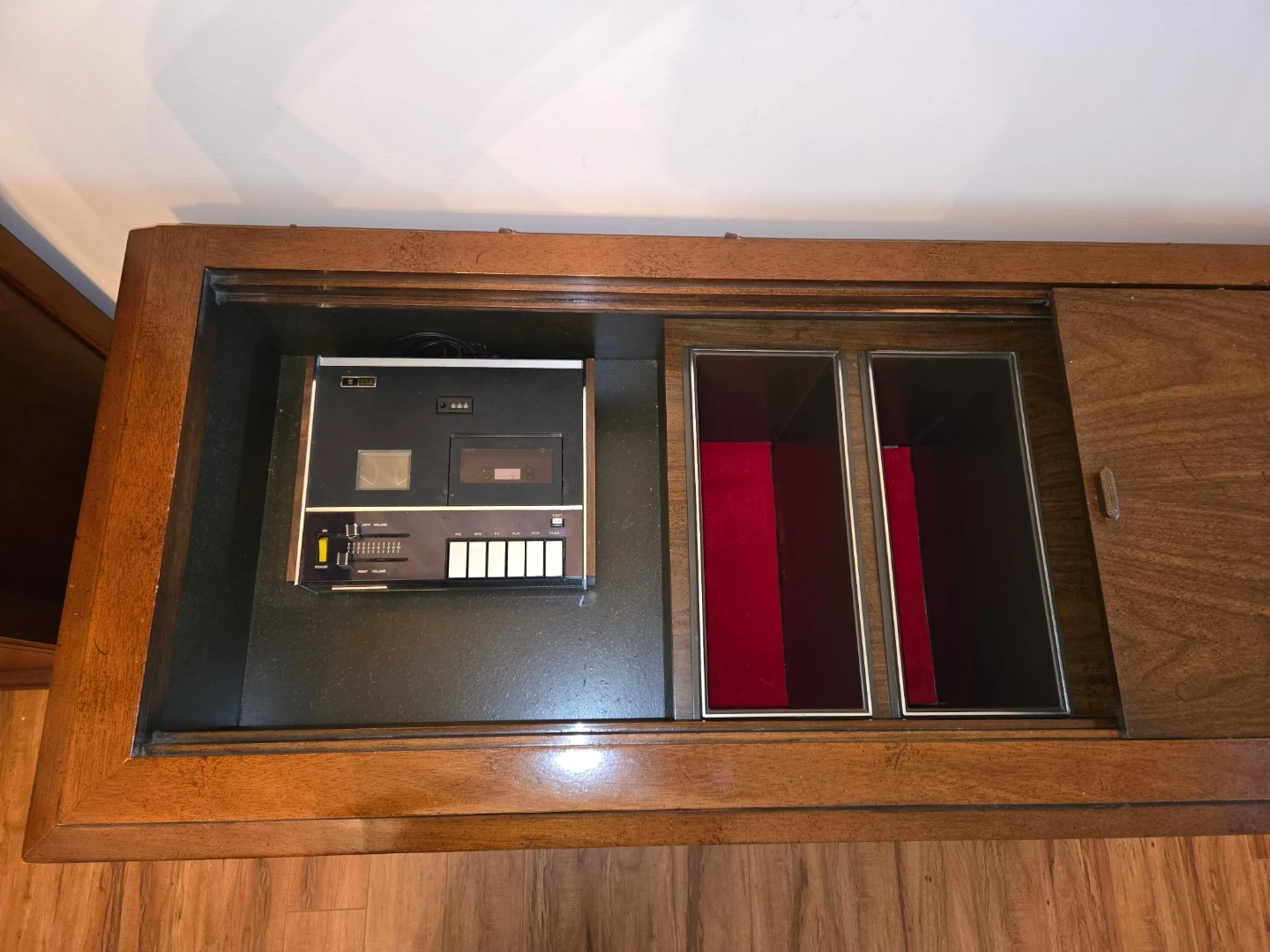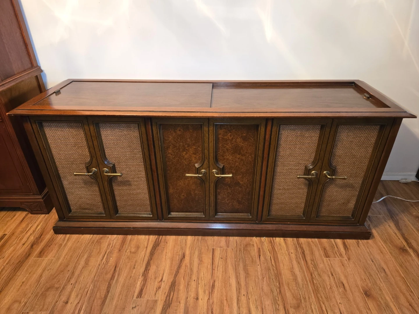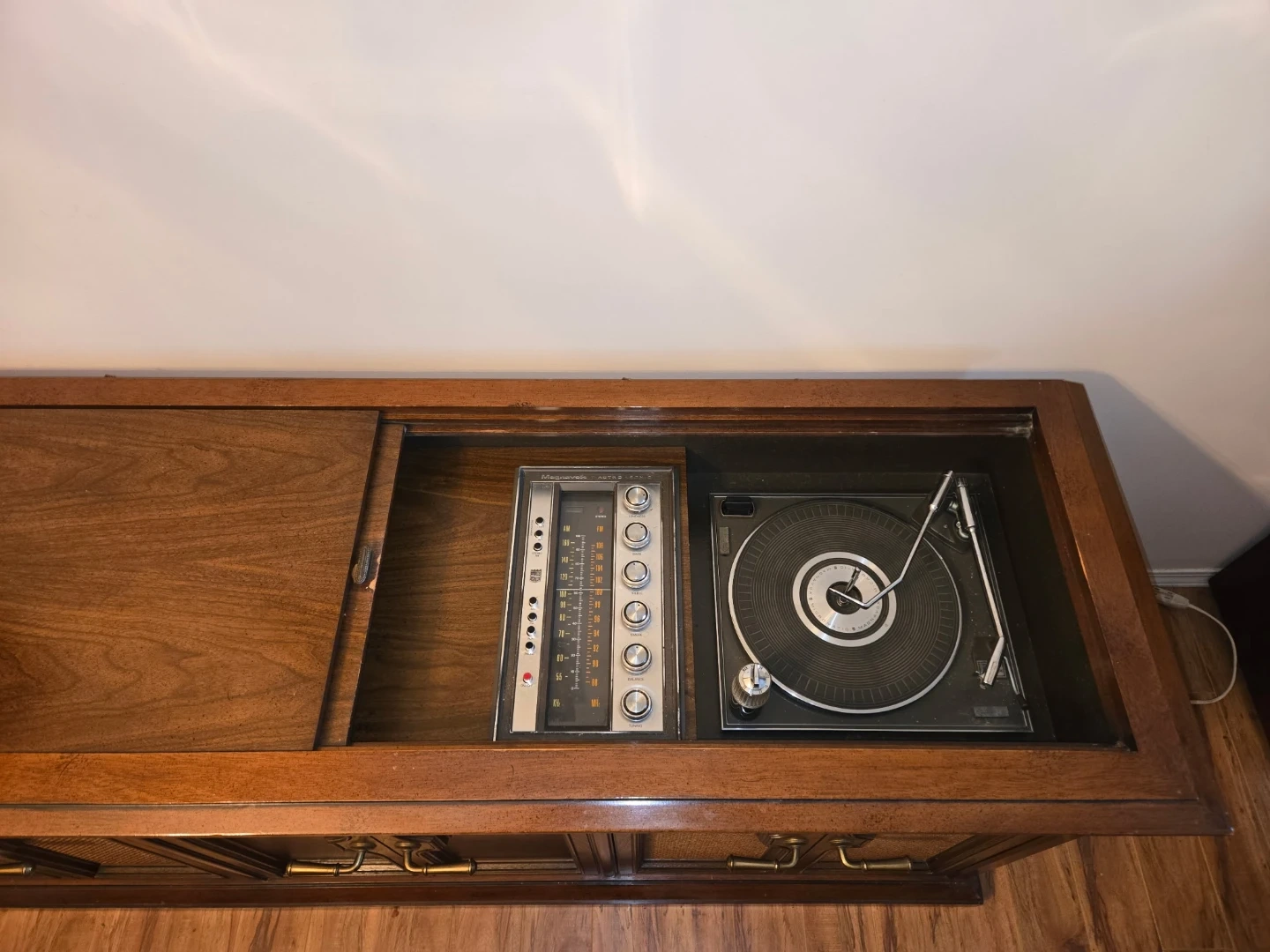 The crowning jewel of this stereo is its distressed walnut console that is in excellent condition. It could be converted to a bar, a cabinet, (see Photo) or modernized with new audio components.