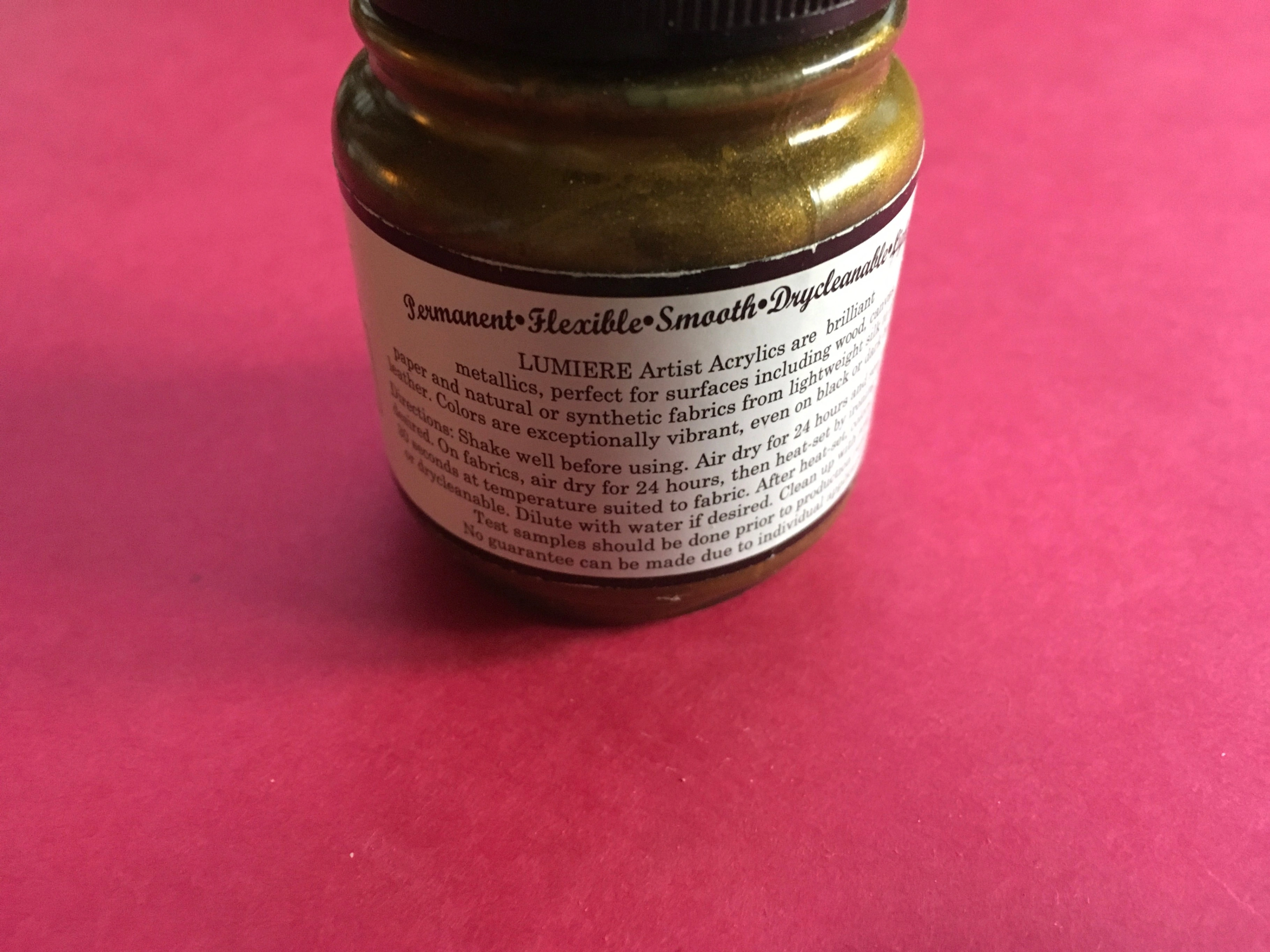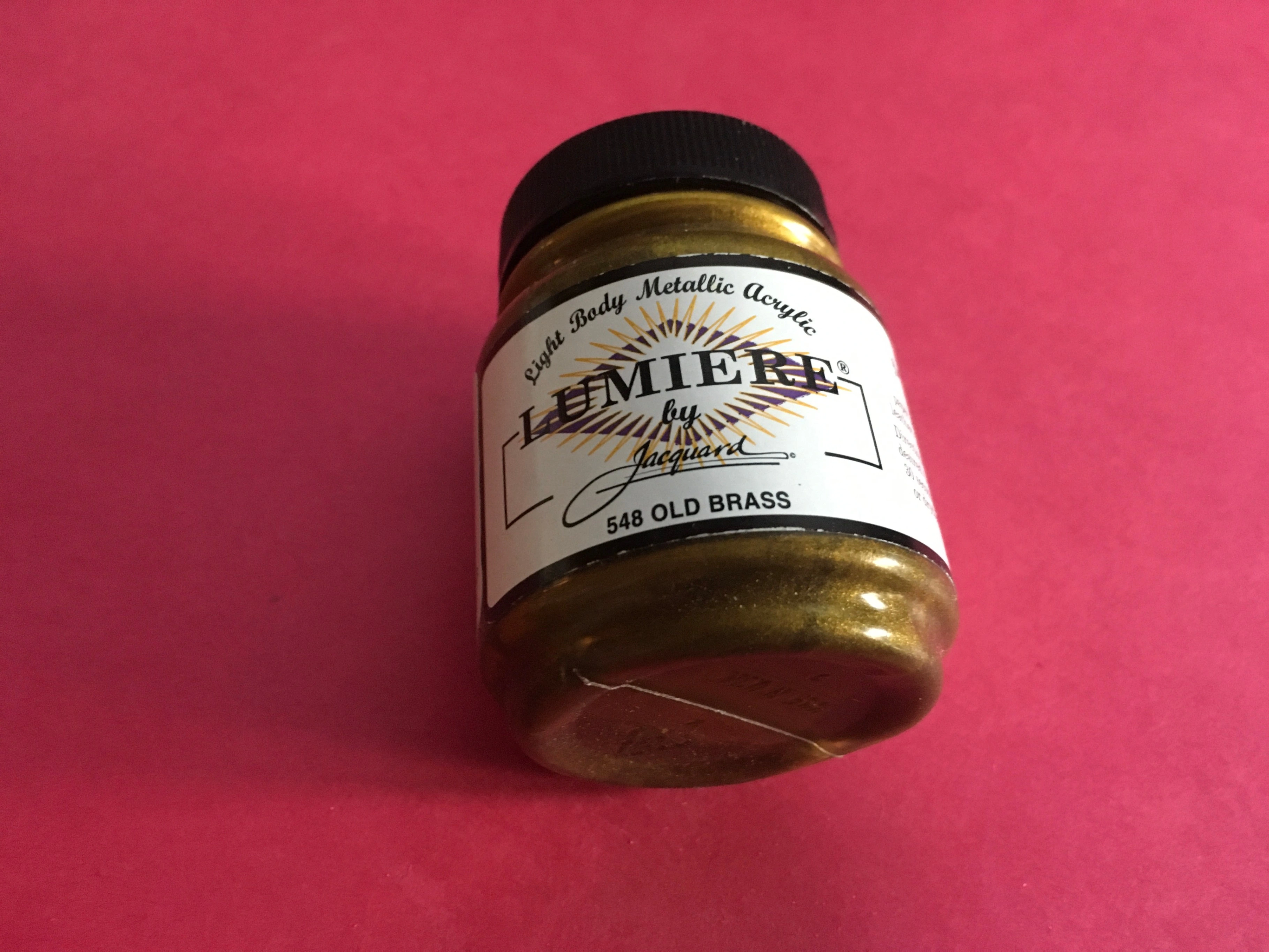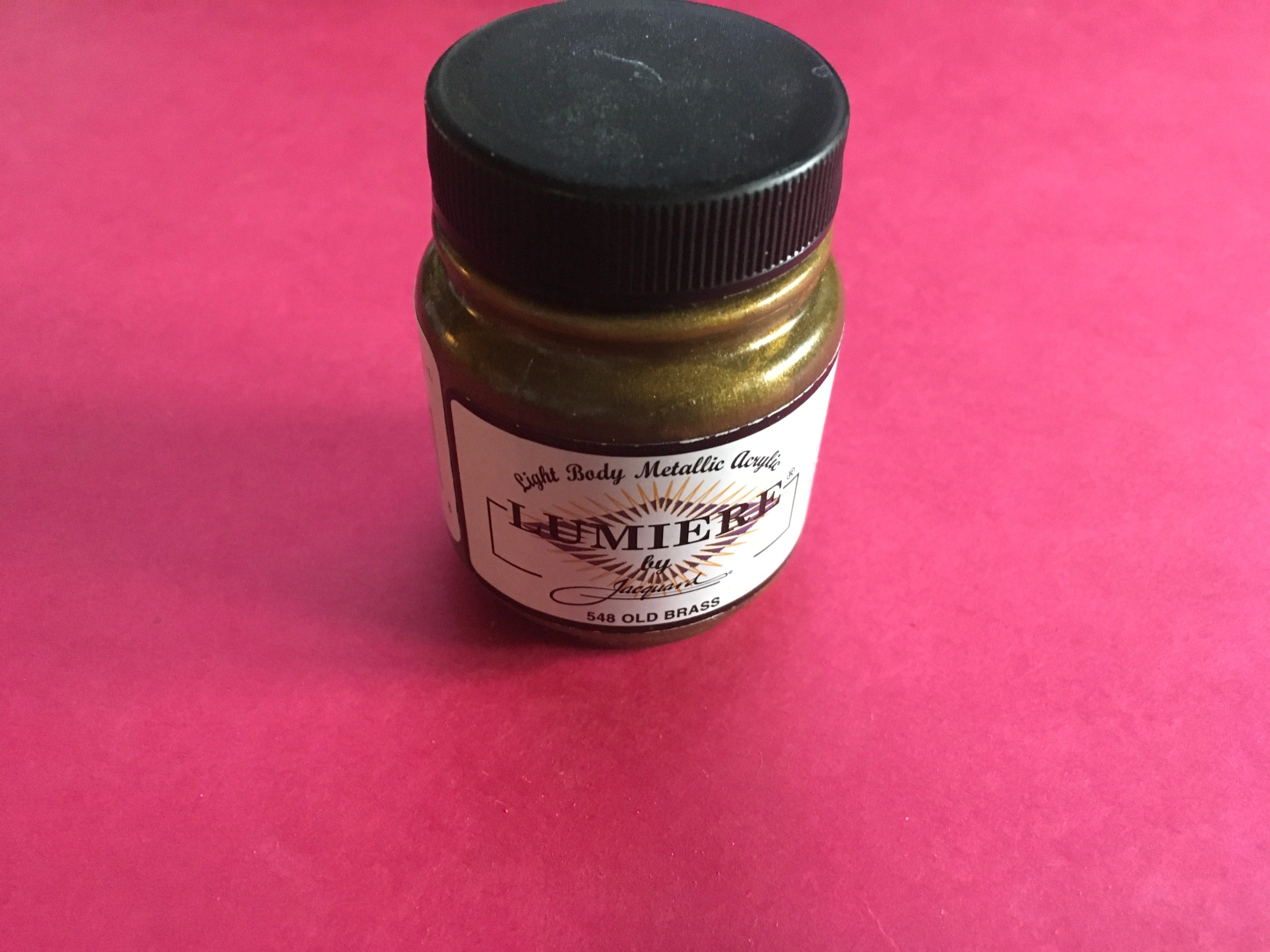 Selling a bottle of Lumiere by Jacquard metallic acrylic paint in the color 548 Old Brass! This is a light body paint that's perfect for surfaces including wood, paper, and natural or synthetic fabrics. It's permanent, flexible, smooth, and drycleanable