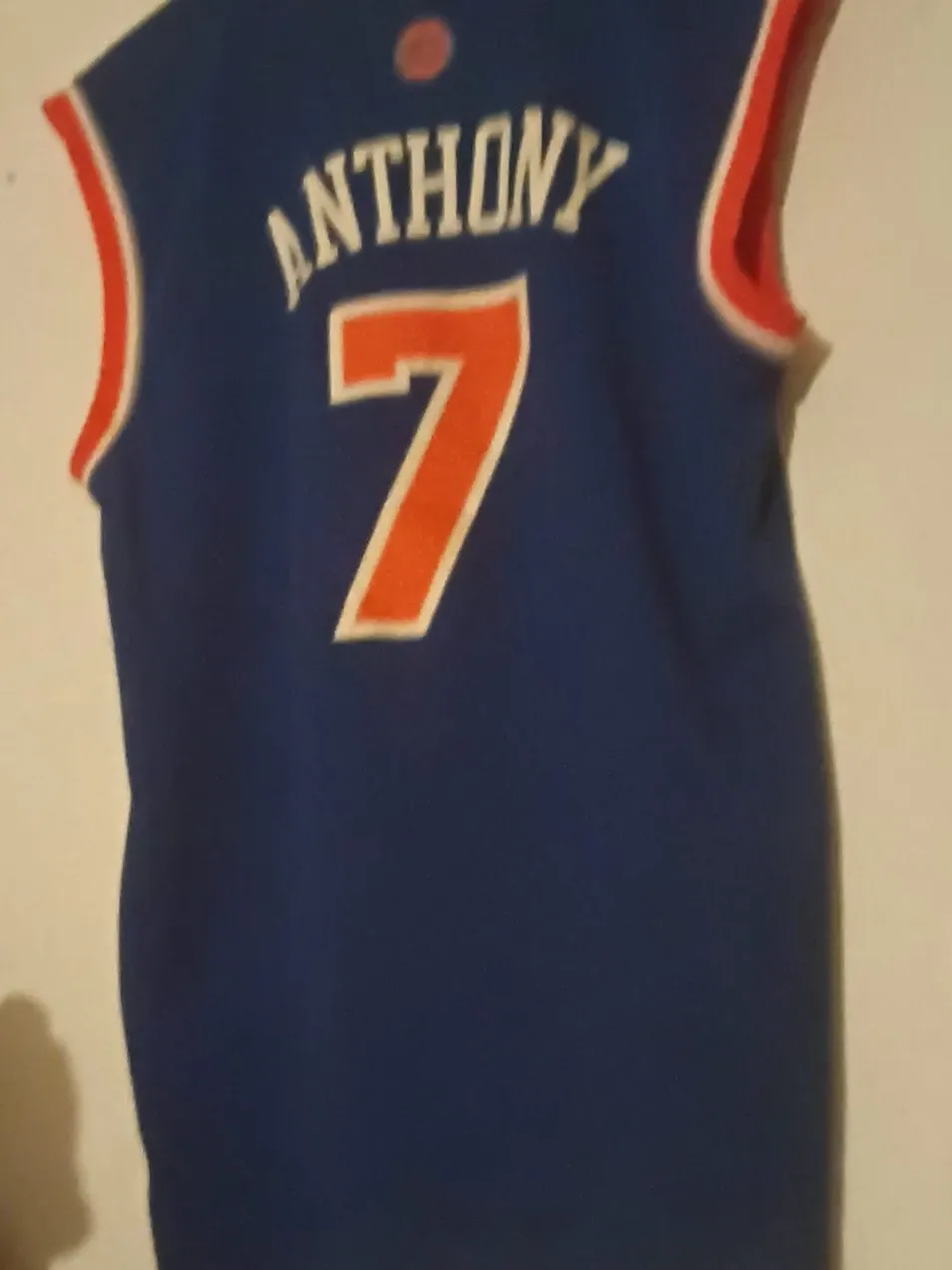 This is a blue basketball jersey featuring 'ANTHONY' and the number '7' in orange with white trim. It's a sleeveless design with red and white trim on the shoulders. Fabric is polyester.