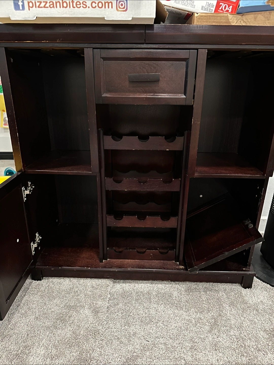 Selling a dark wood wine rack cabinet with a drawer and shelving! It has a spot for wine bottles and storage for other items. Great for a dining room or living room. One of the bottom drawers came off and needs to be put back on.