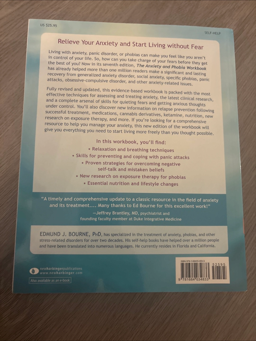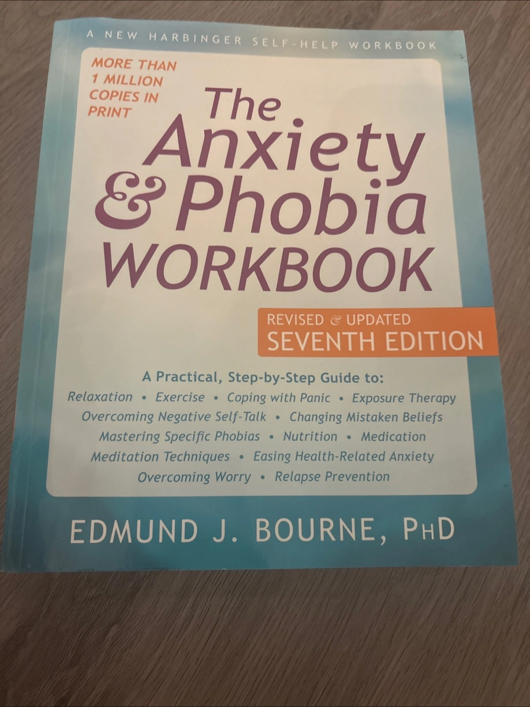 Selling "The Anxiety & Phobia Workbook" by Edmund J. Bourne, PhD. This is the revised and updated seventh edition. It is a practical, step-by-step guide to relaxation, exercise, coping with panic, exposure therapy, overcoming negative self-talk, changing mistaken beliefs, mastering specific phobias, nutrition, medication, meditation techniques, easing health-related anxiety, overcoming worry, and relapse prevention