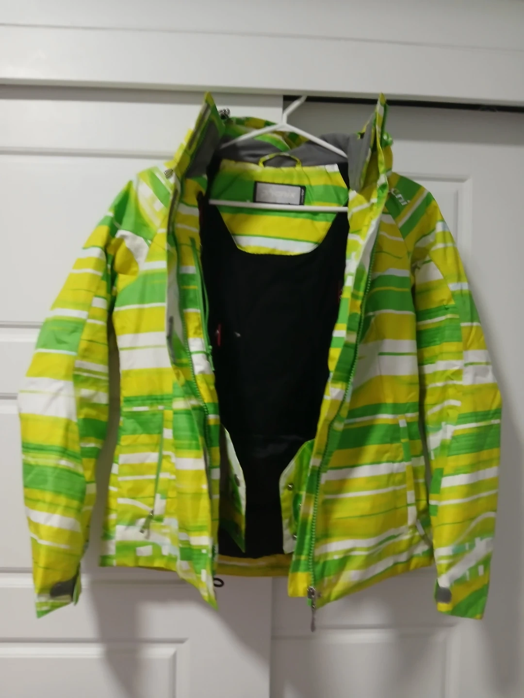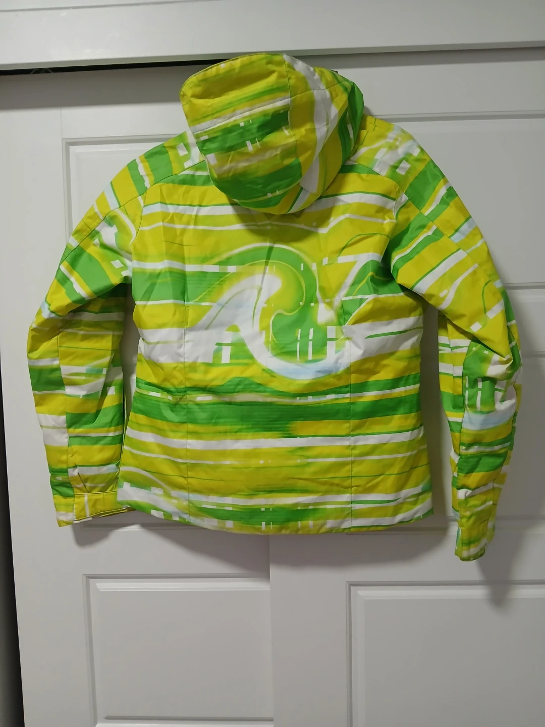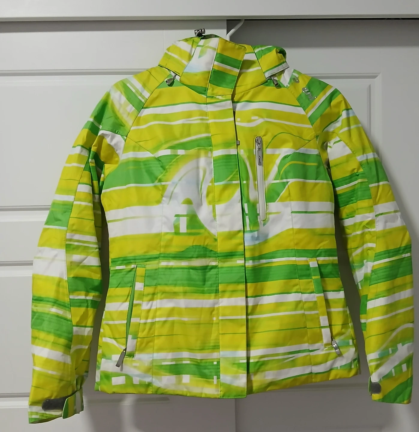 Phenix women's ski jacket in a vibrant green and yellow striped pattern. It's designed for outdoor winter activities. This jacket is great for hitting the slopes!