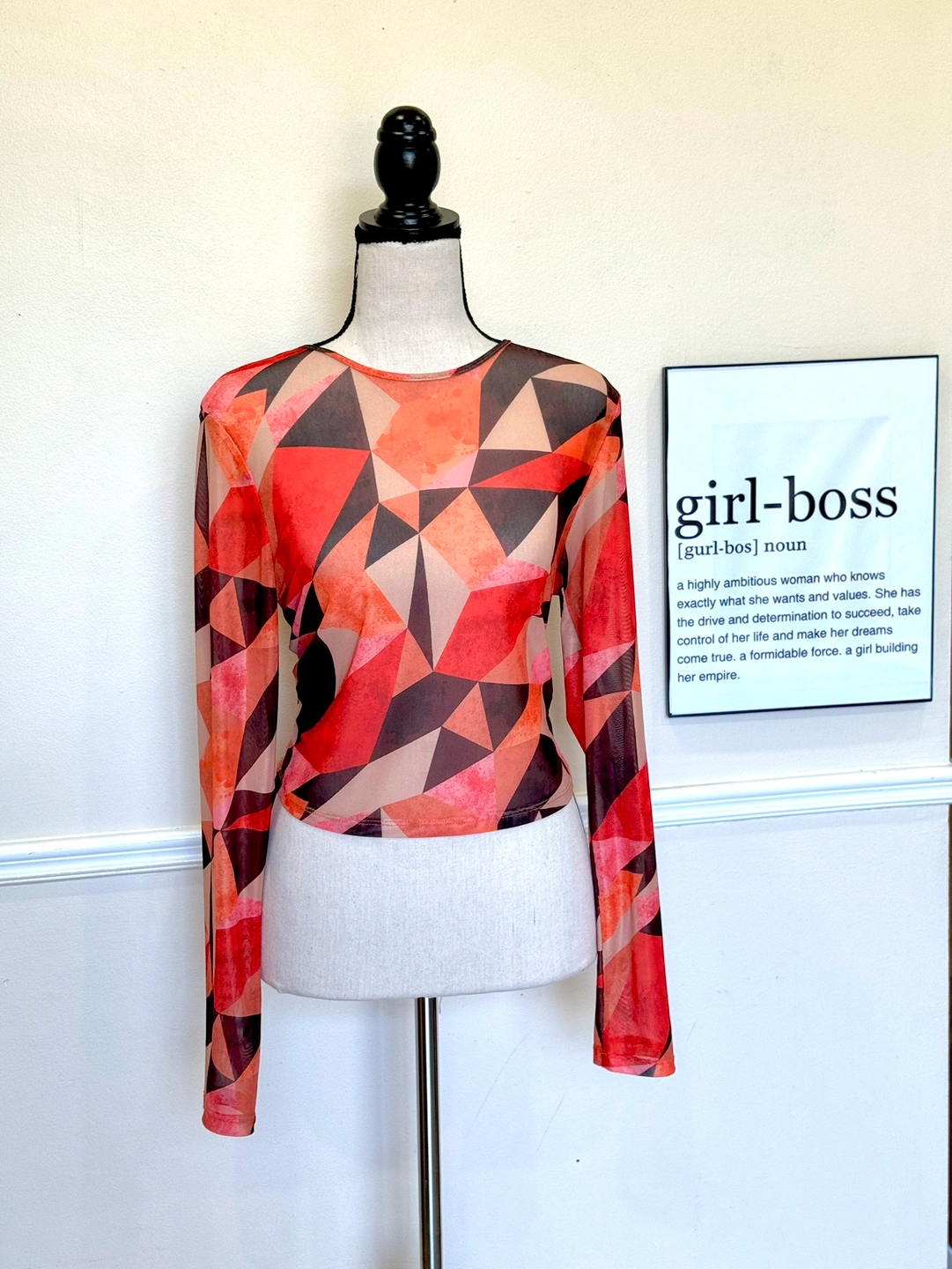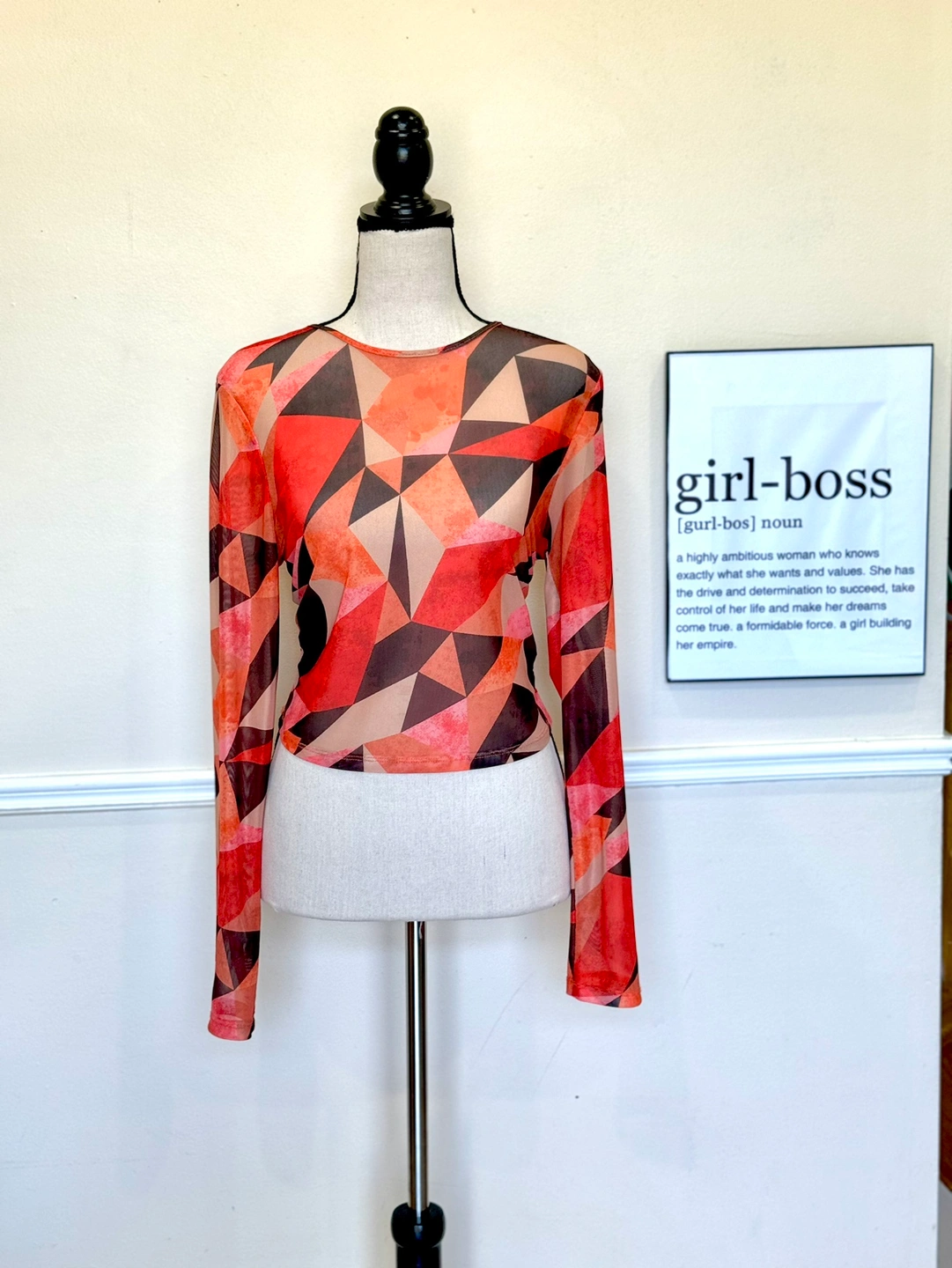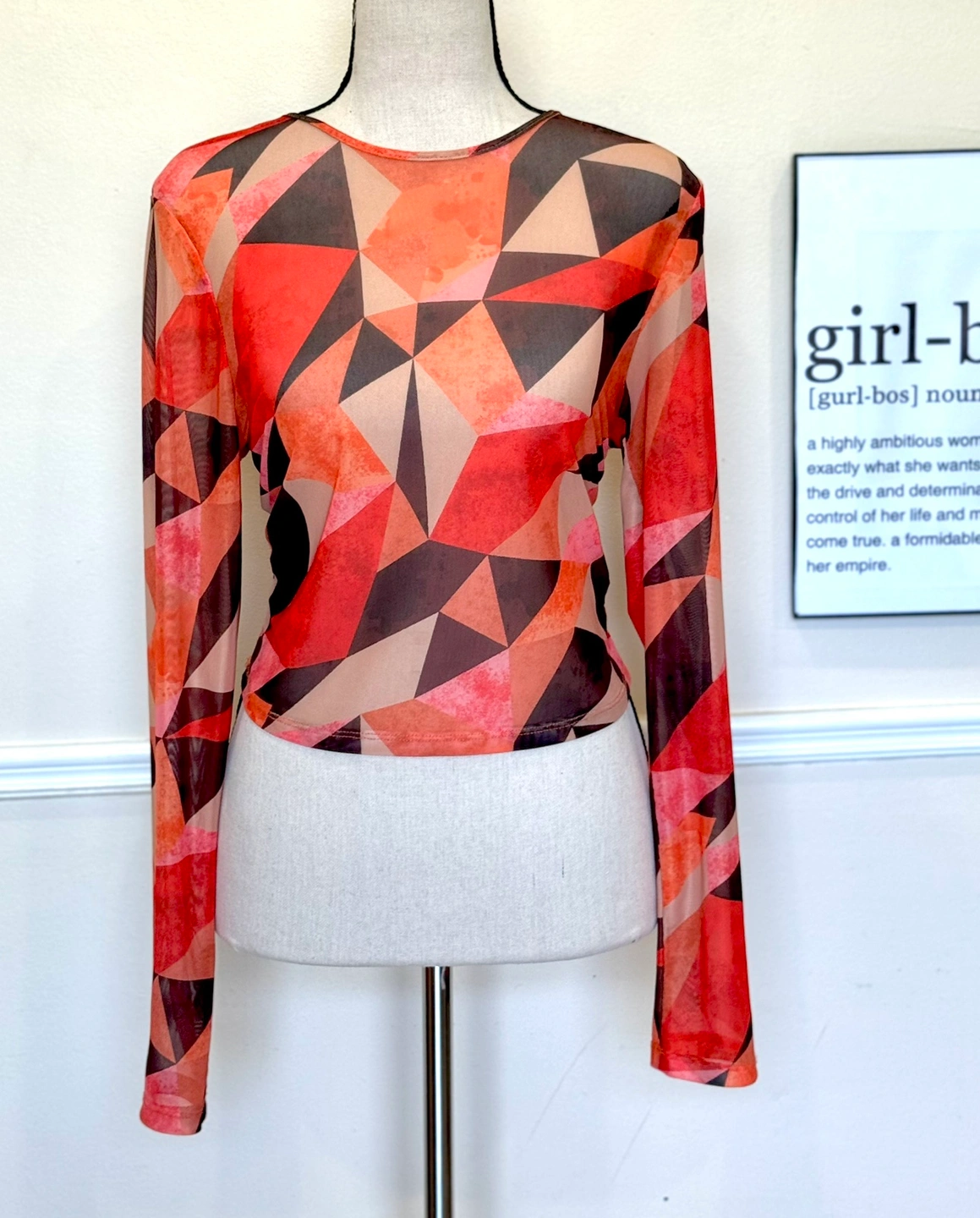 Orange and black geometric patterned mesh long sleeve top with a scoop neckline. The top is fitted and cropped in length.