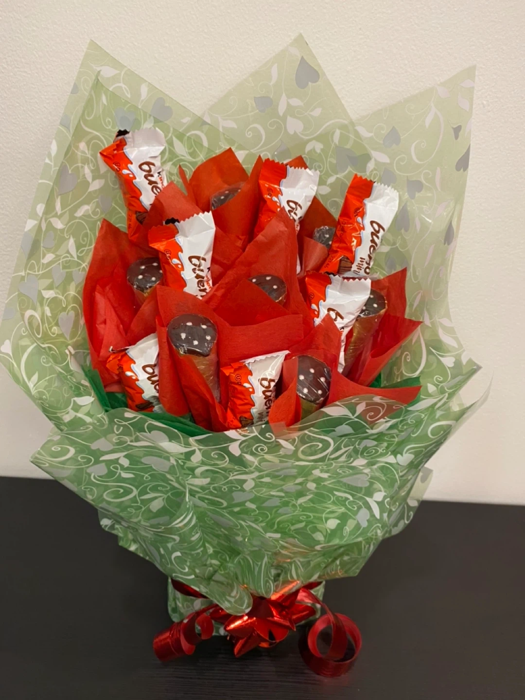 A thoughtful bouquet with several Kinder Bueno bars and individually wrapped Kinder chocolates. It is wrapped in green decorative paper with a red ribbon. This sweet arrangement will be a wonderful surprise for any chocolate lover!