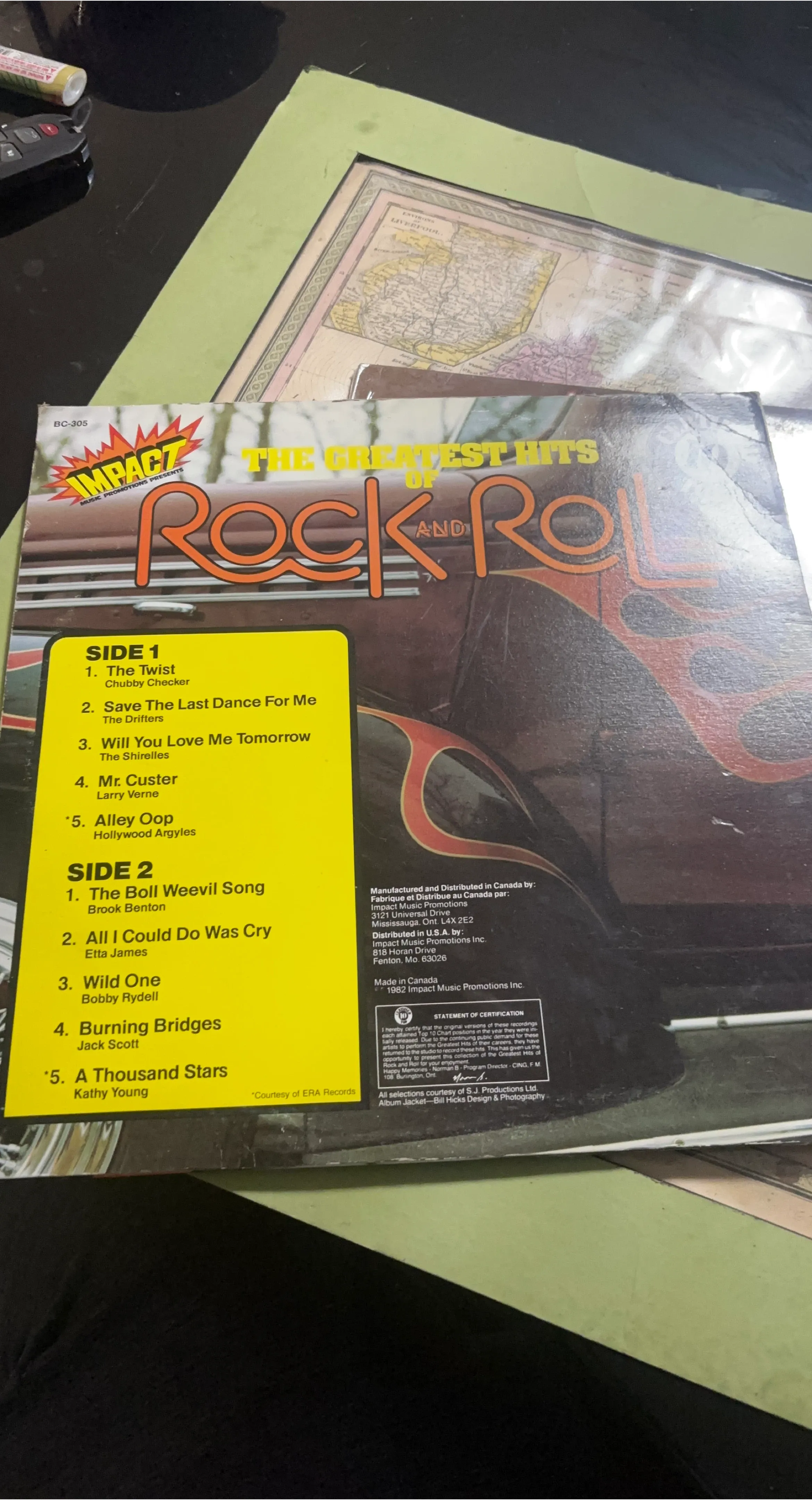 This Impact Music Promotions vinyl features a collection of greatest hits from the rock and roll era. It includes tracks by artists like Chubby Checker, The Drifters, and Etta James. The album was manufactured and distributed by Impact Music Promotions in Canada in 1982.