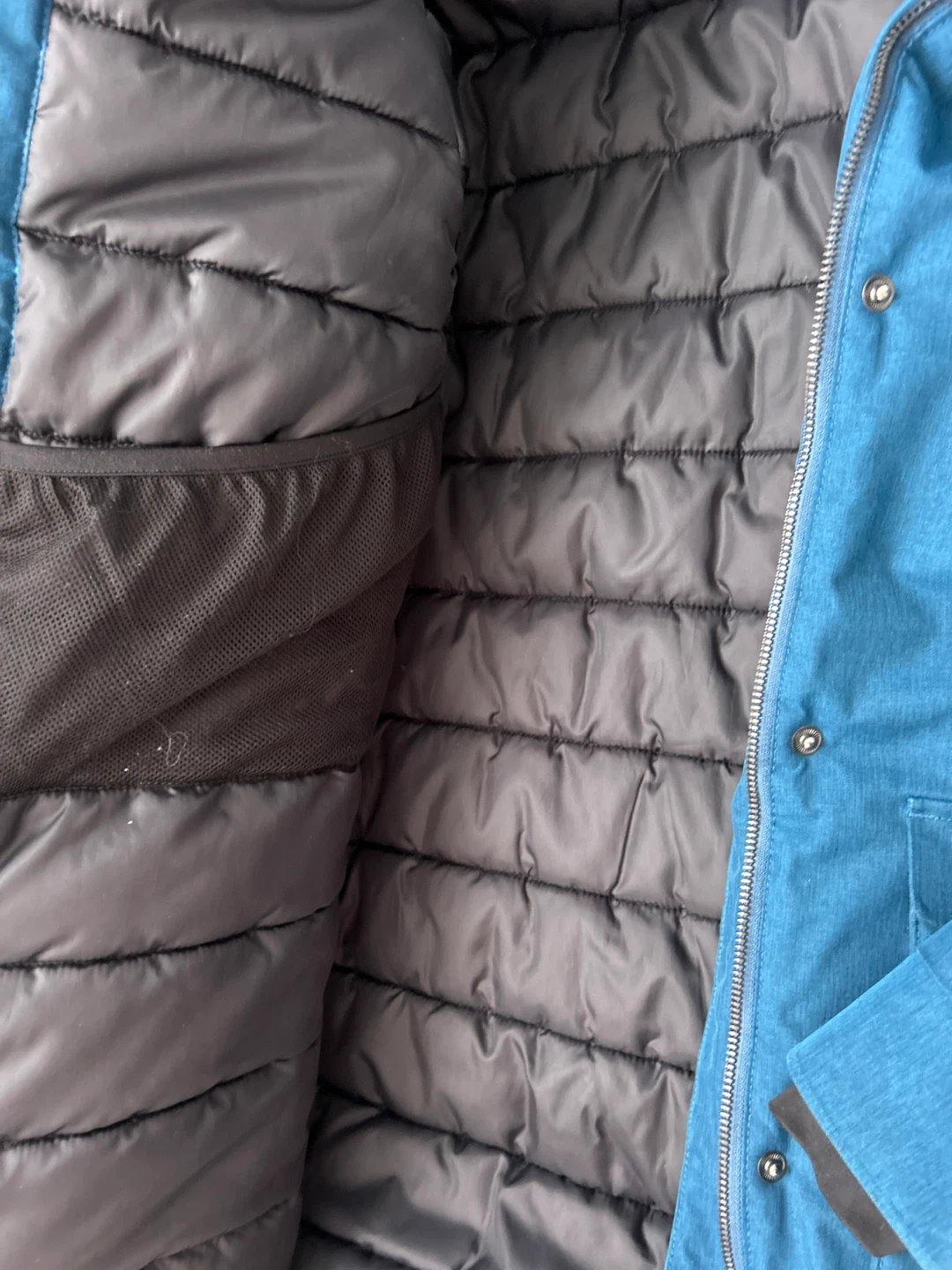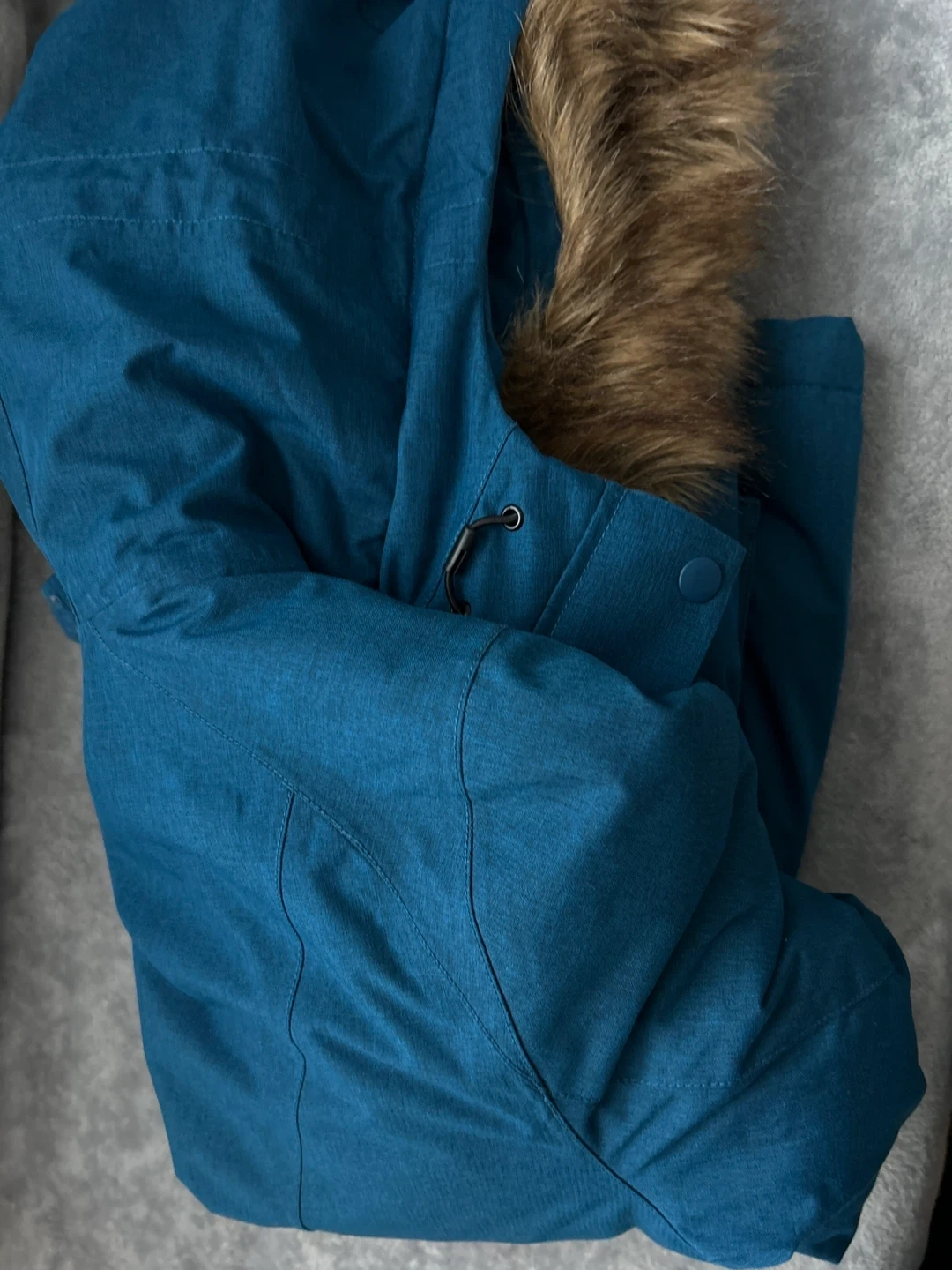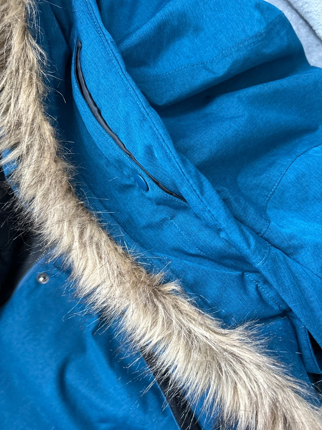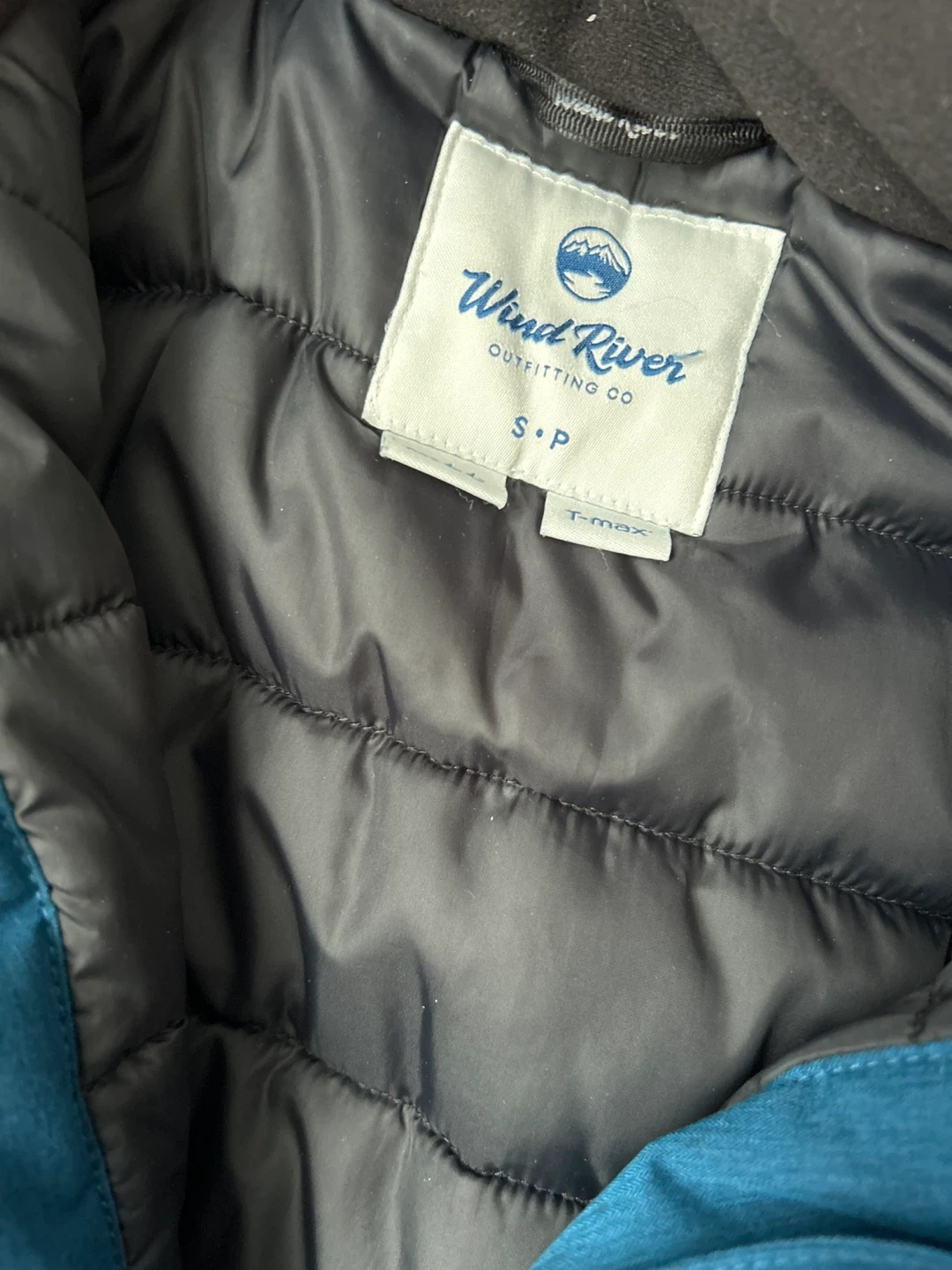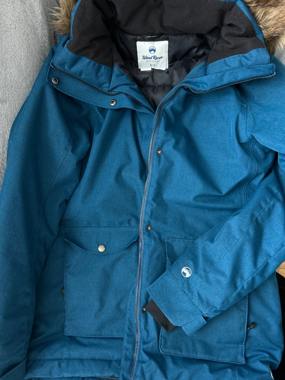 Wind River Outfitters insulated winter jacket in a nice teal colour. Features a faux fur-lined hood and T-max insulation. Size S.Pockets include two outer flap pockets with snaps, one zippered chest pocket, and an inner mesh pocket. Very warm and lightweight