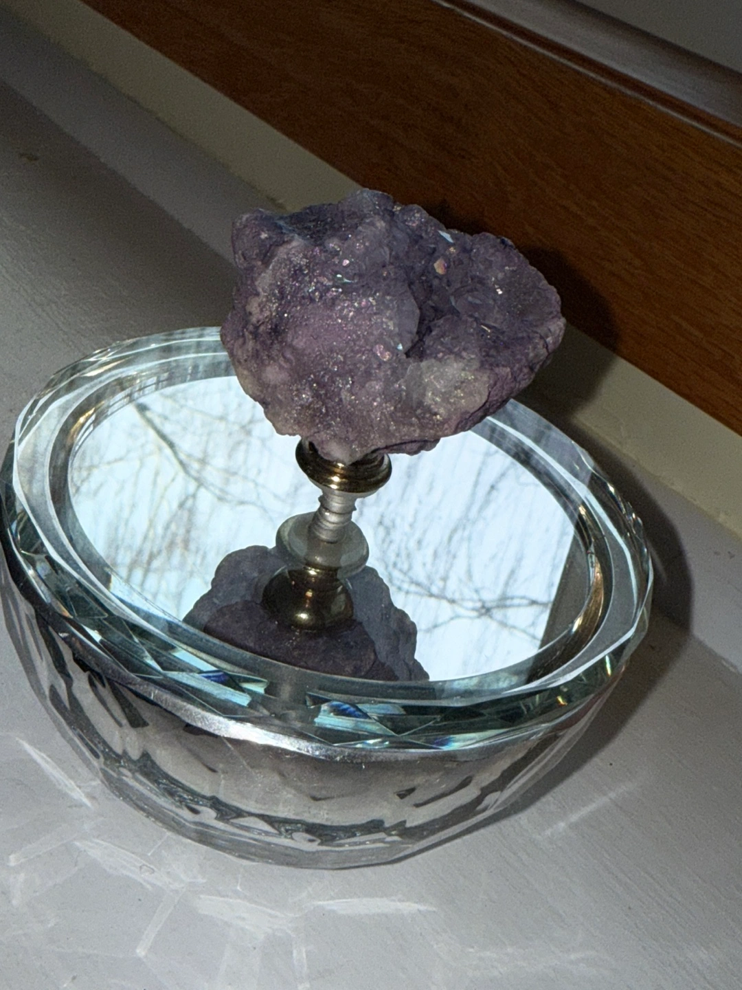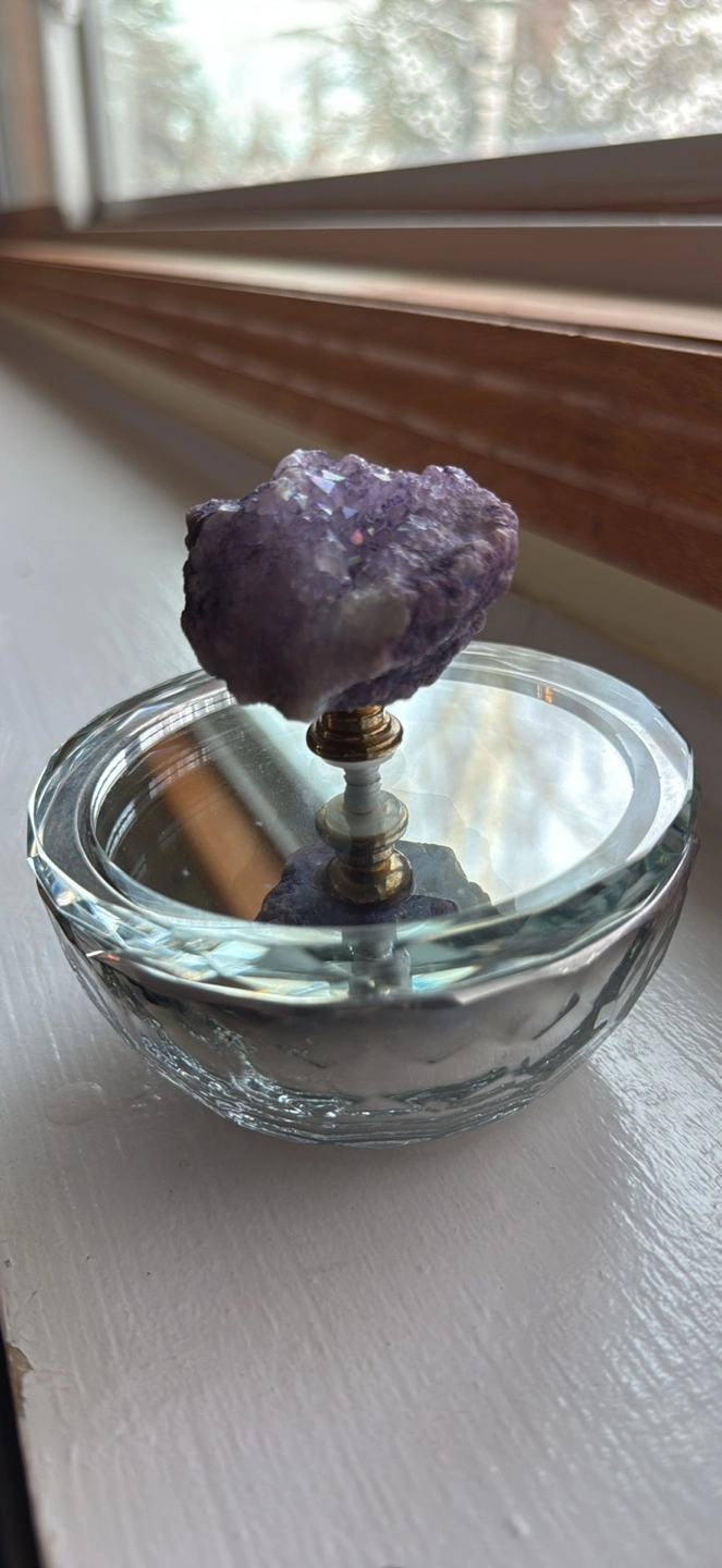 Firm on price. Glass trinket dish featuring an amethyst geode. Mirrored lid. Perfect for jewelry or other small items. Pick up in SE Mapleridge near Acadia