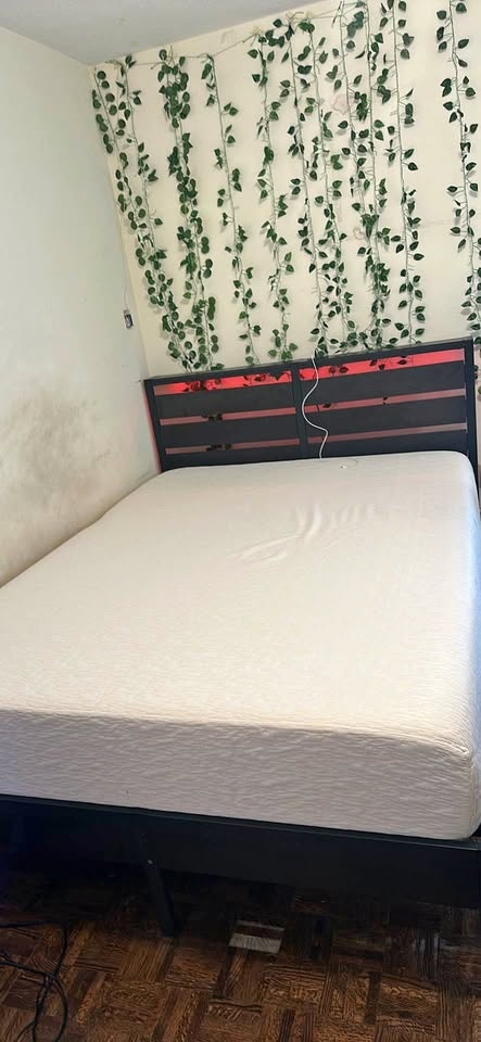 Comfortable mattress with a sturdy bed frame and modern headboard. The headboard includes LED lighting and built-in charging ports (USB & USB-C) for phones and devices. It's clean and well maintained, with minor wear on the mattress. Supportive and comfortable for everyday use. Selling because I’m moving.