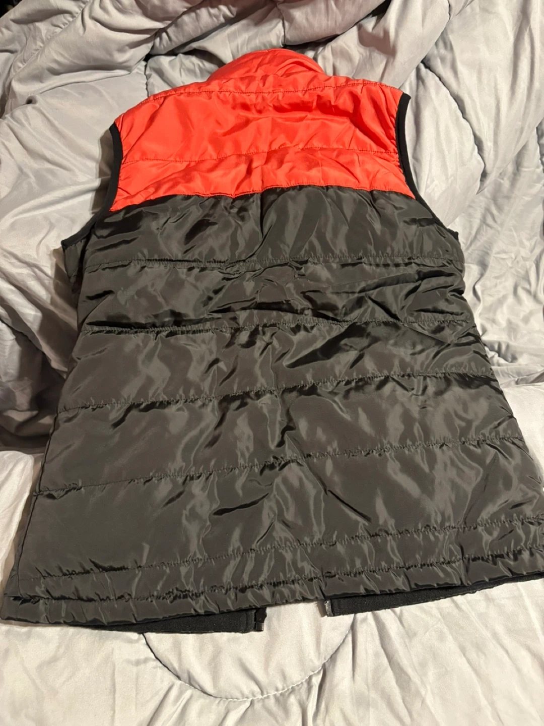 Here's a new puffer vest in a stylish two-tone design! The top is a vibrant orange and the bottom is a sleek grey. It's perfect for adding a layer of warmth on those cooler days