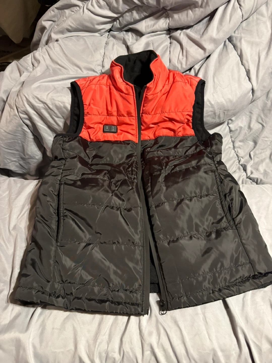 Here's a new puffer vest in a stylish two-tone design! The top is a vibrant orange and the bottom is a sleek grey. It's perfect for adding a layer of warmth on those cooler days