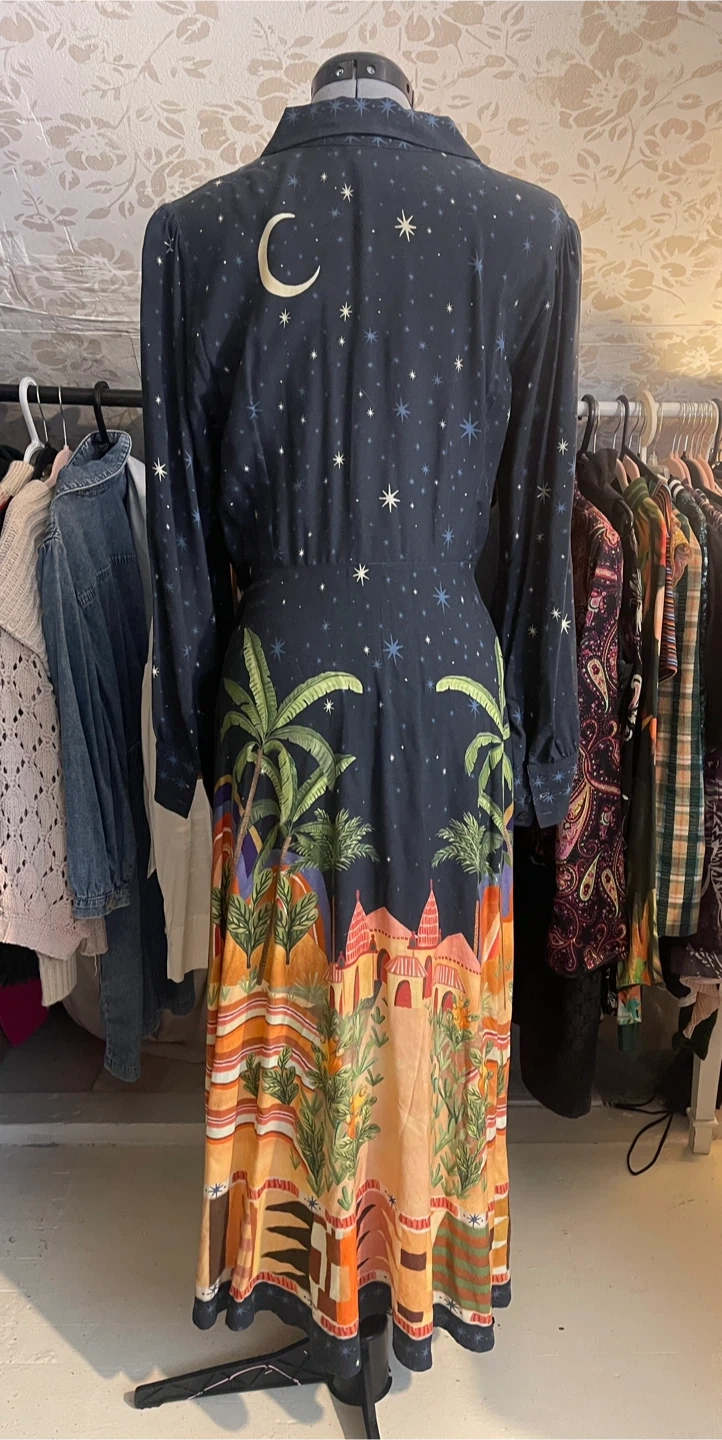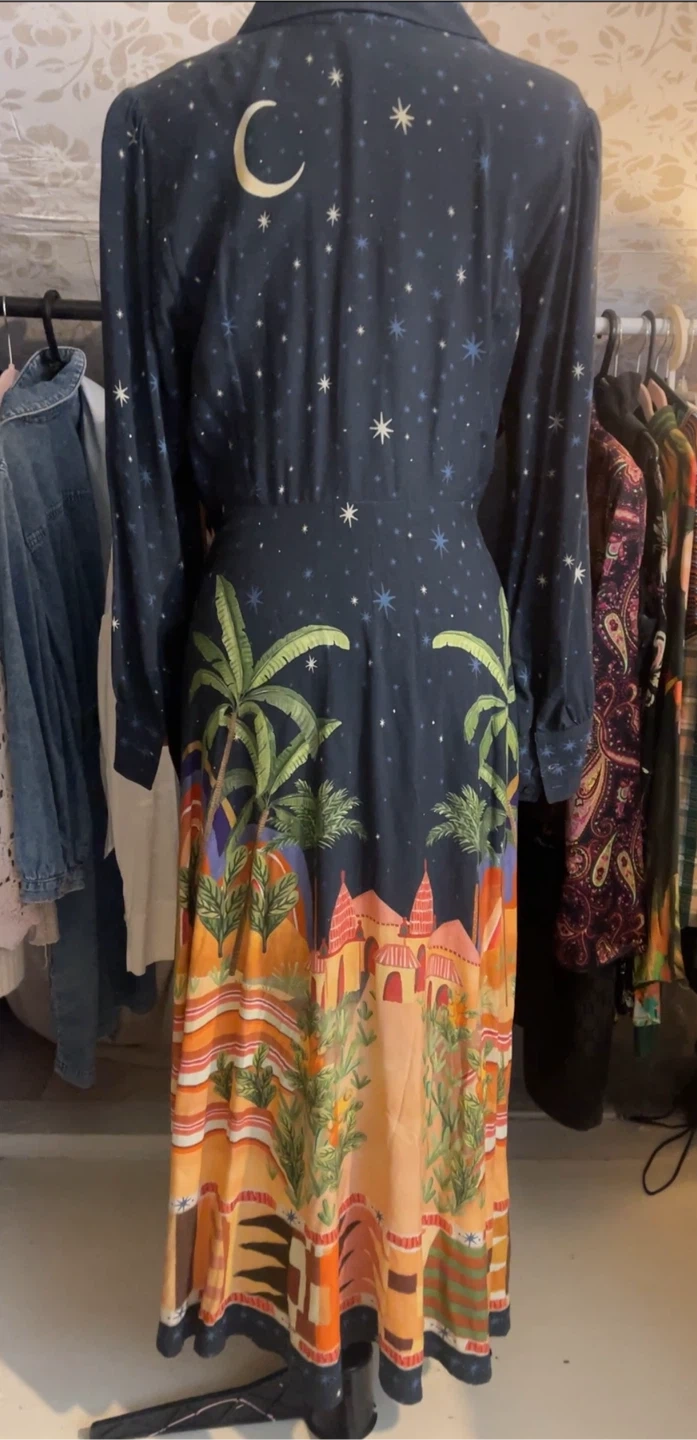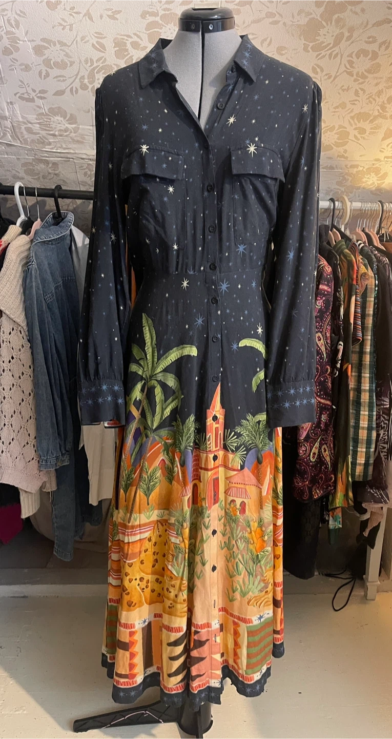 This is not a common FARM dress — it’s a limited Brazilian-made scenic maxi, extremely sought after by collectors.