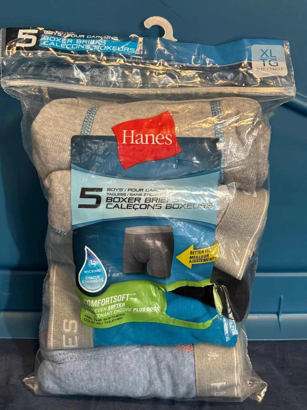 Hanes boys' boxer briefs in a 5-pack. Size XL. Features ComfortSoft fabric with wicking properties for moisture management and a better fit. Tagless design.