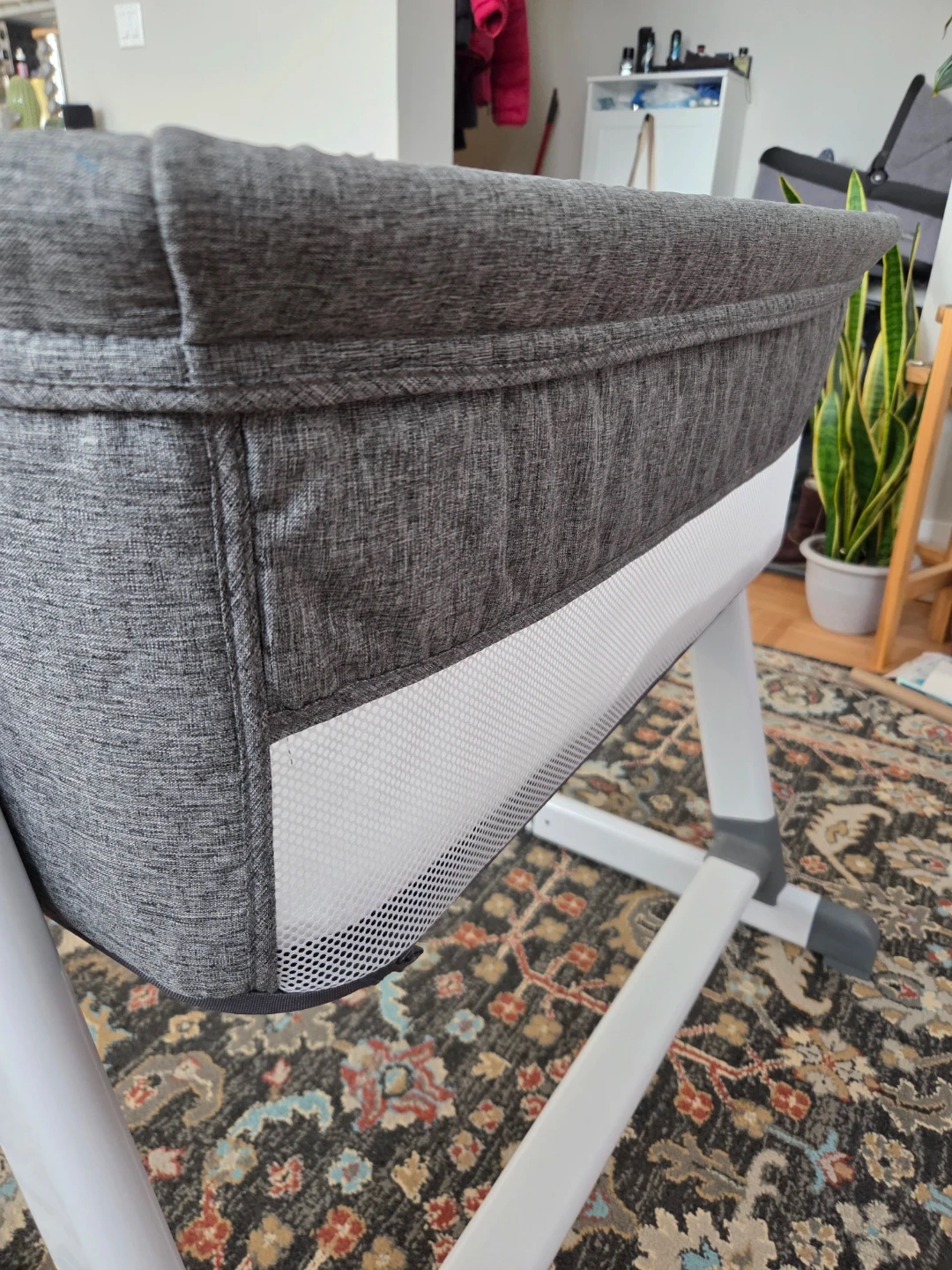 This Delta Children bassinet is grey and comes with convenient side pockets. It has two mesh sides for good air flow. The height is adjustable to fit above most beds.