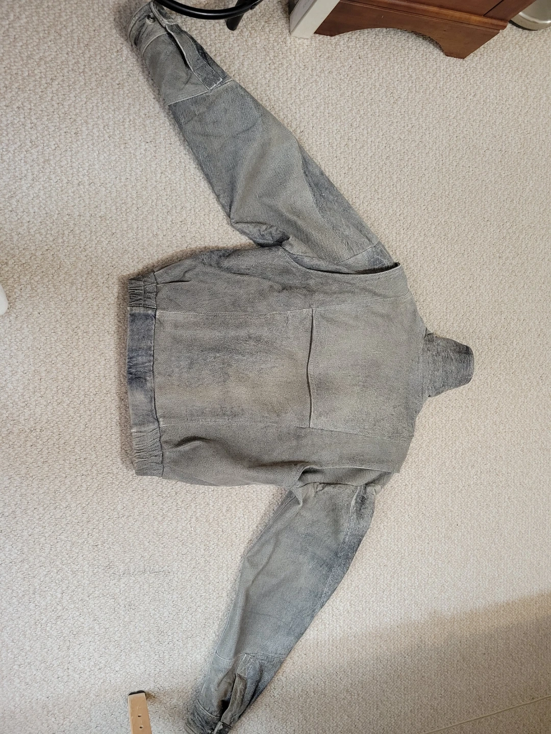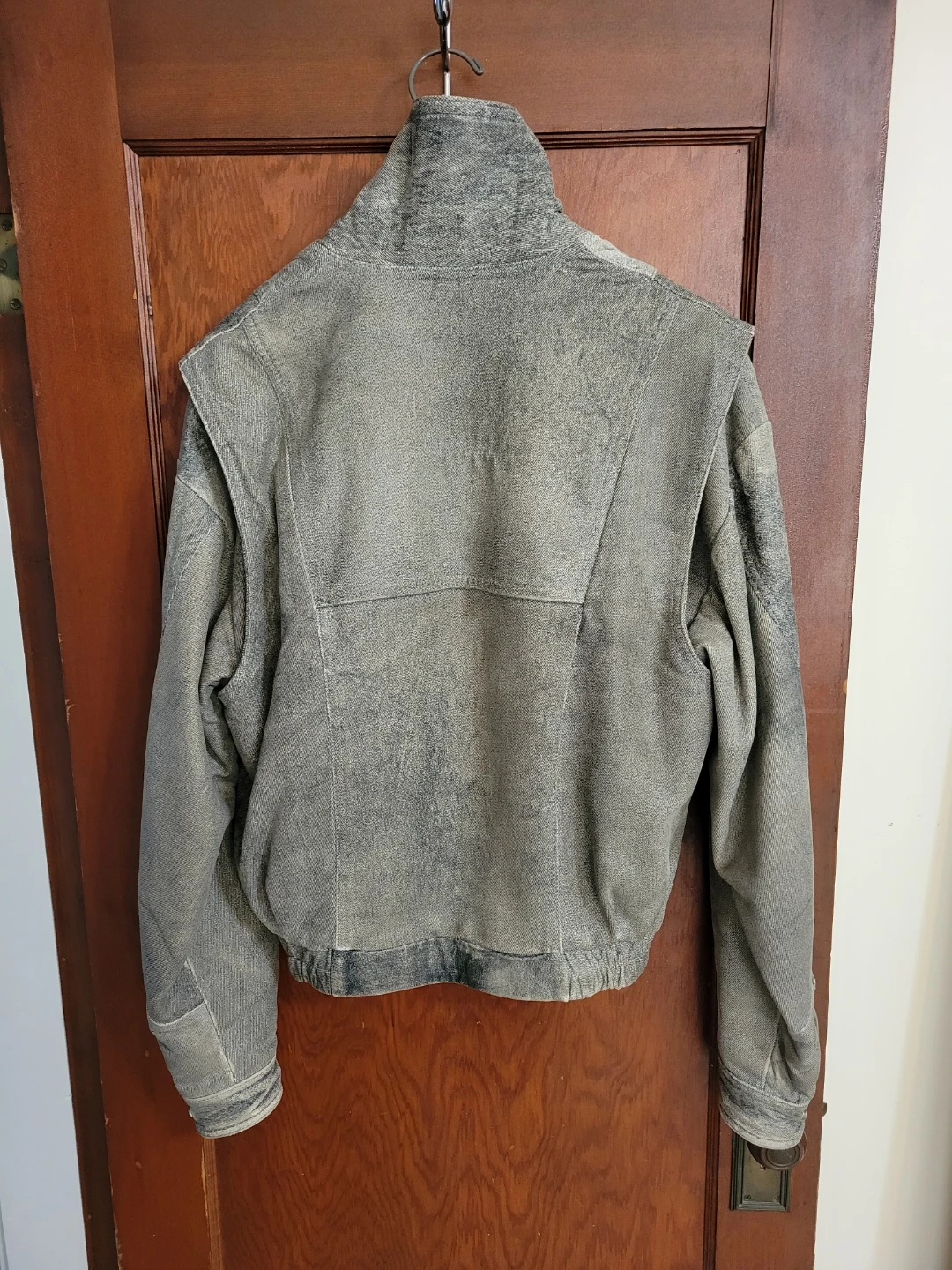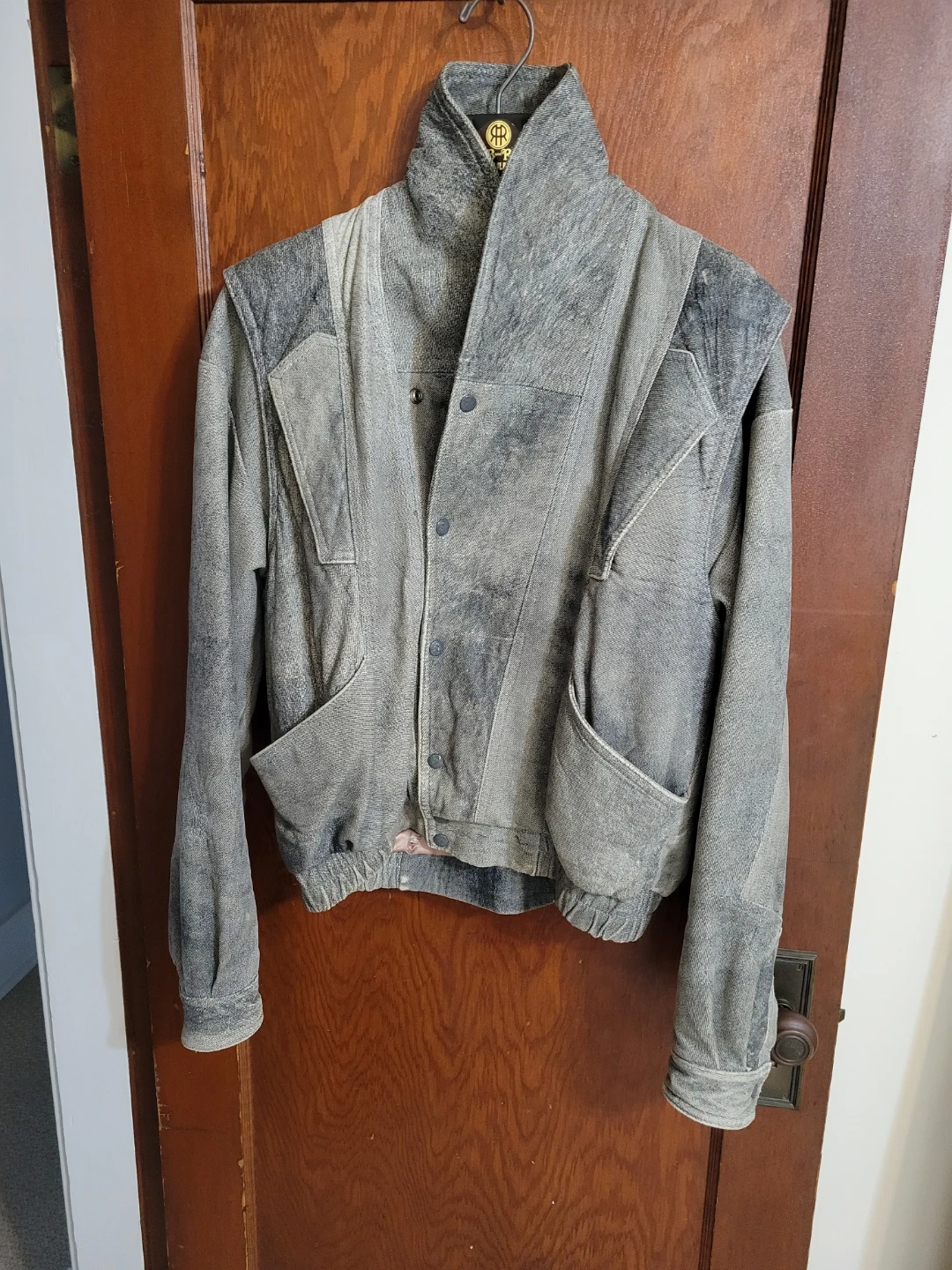 This is a grey genuine leather bomber jacket. The outershell is 100% genuine leather, and the lining is 100% acetate. Made in Canada.Denim styled leather jacket sold by Leather Ranch in the 80's. 2 small holes at bottom of the back lining. Sleeves zip off to convert to a vest.