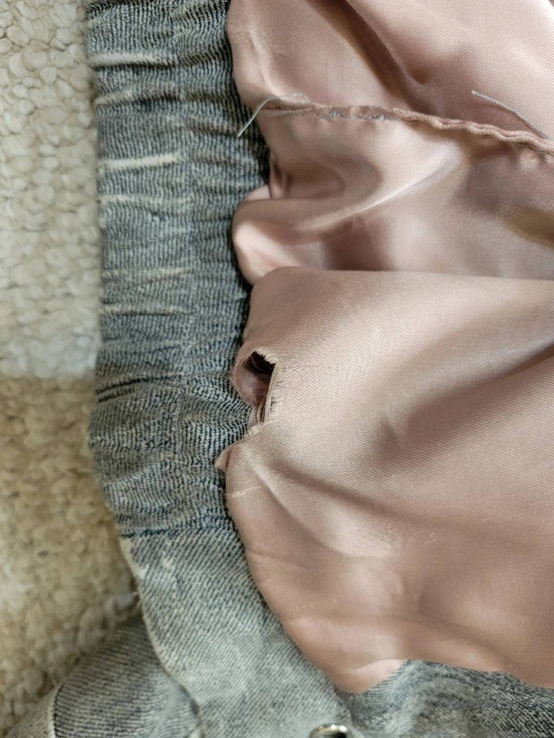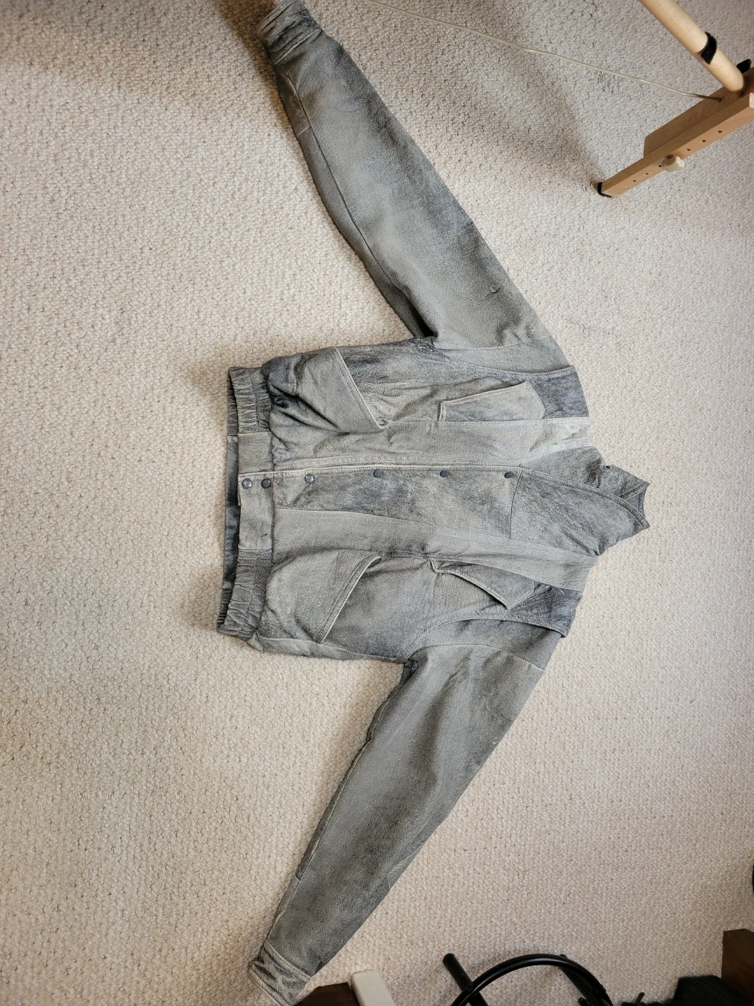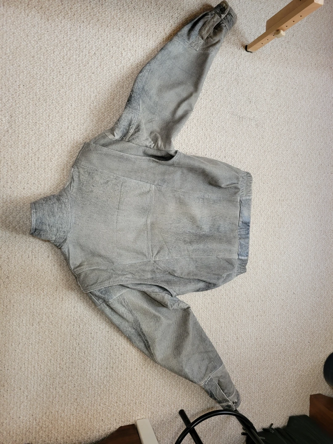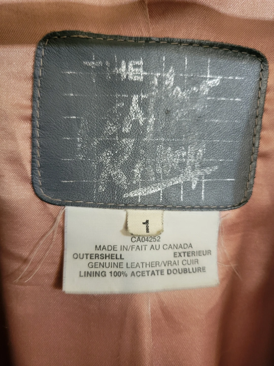 This is a grey genuine leather bomber jacket. The outershell is 100% genuine leather, and the lining is 100% acetate. Made in Canada.Denim styled leather jacket sold by Leather Ranch in the 80's. 2 small holes at bottom of the back lining. Sleeves zip off to convert to a vest.