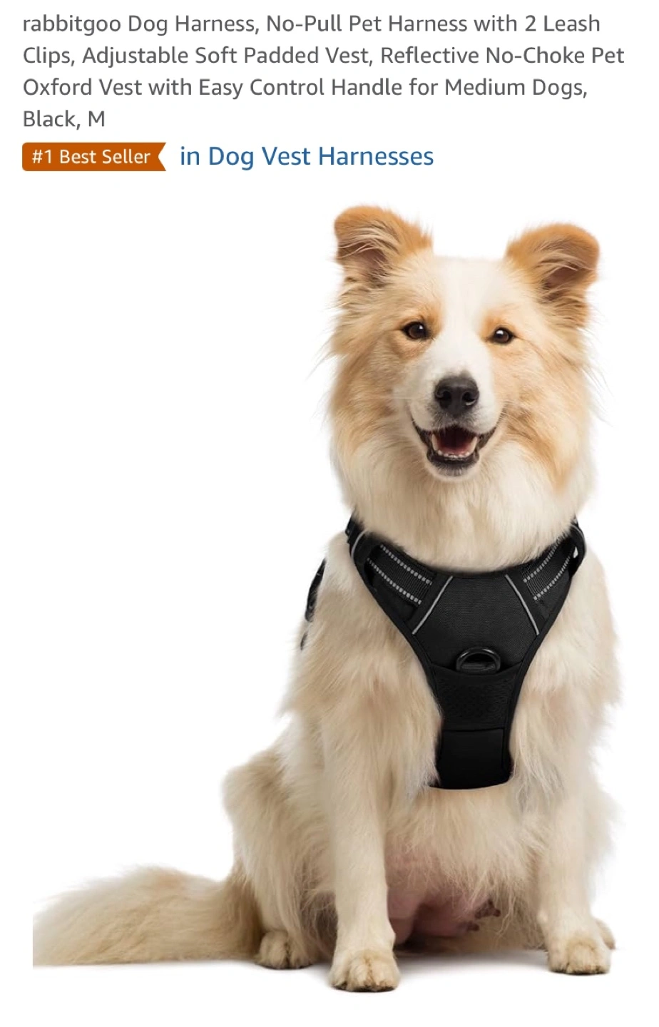 207No-pull pet harness with 2 leash clips. Adjustable soft padded vest. Reflective no-choke Oxford vest. Easy control handle for medium dogs.