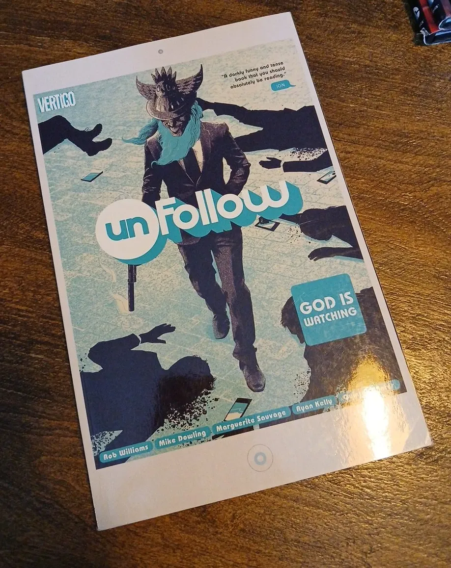 This is Unfollow Vol. 1 from Vertigo, featuring writing by Rob Williams and art by Mike Dowling and Marguerite Sauvage. God is Watching, and it's a darkly funny and tense book. It's a graphic novel, perfect for fans of the genre.