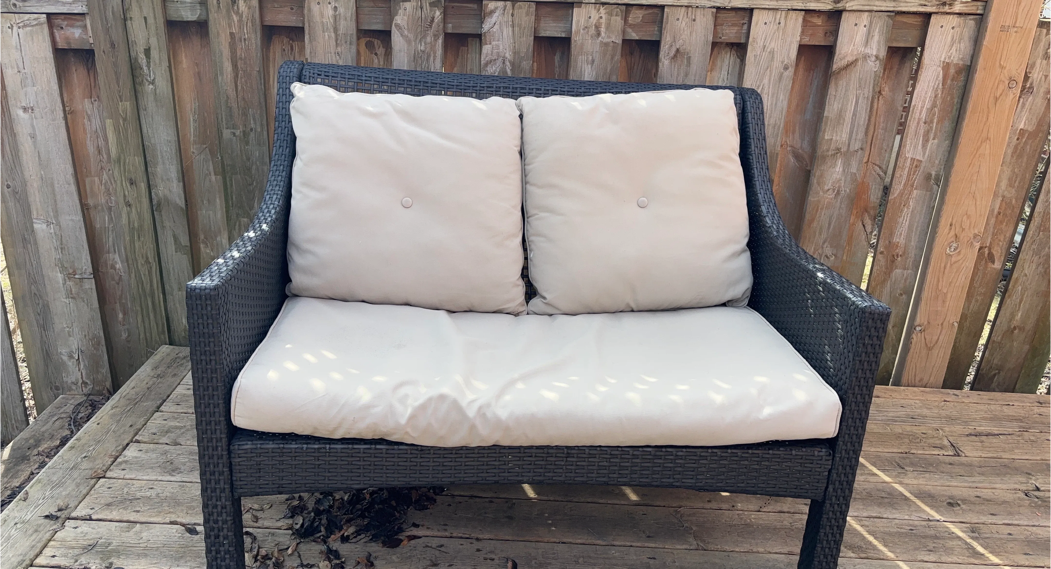 Dark wicker loveseat with light beige cushions. It has a two-seater design with tufted back cushions. Perfect for patios or balconies. Sturdy construction for outdoor use.