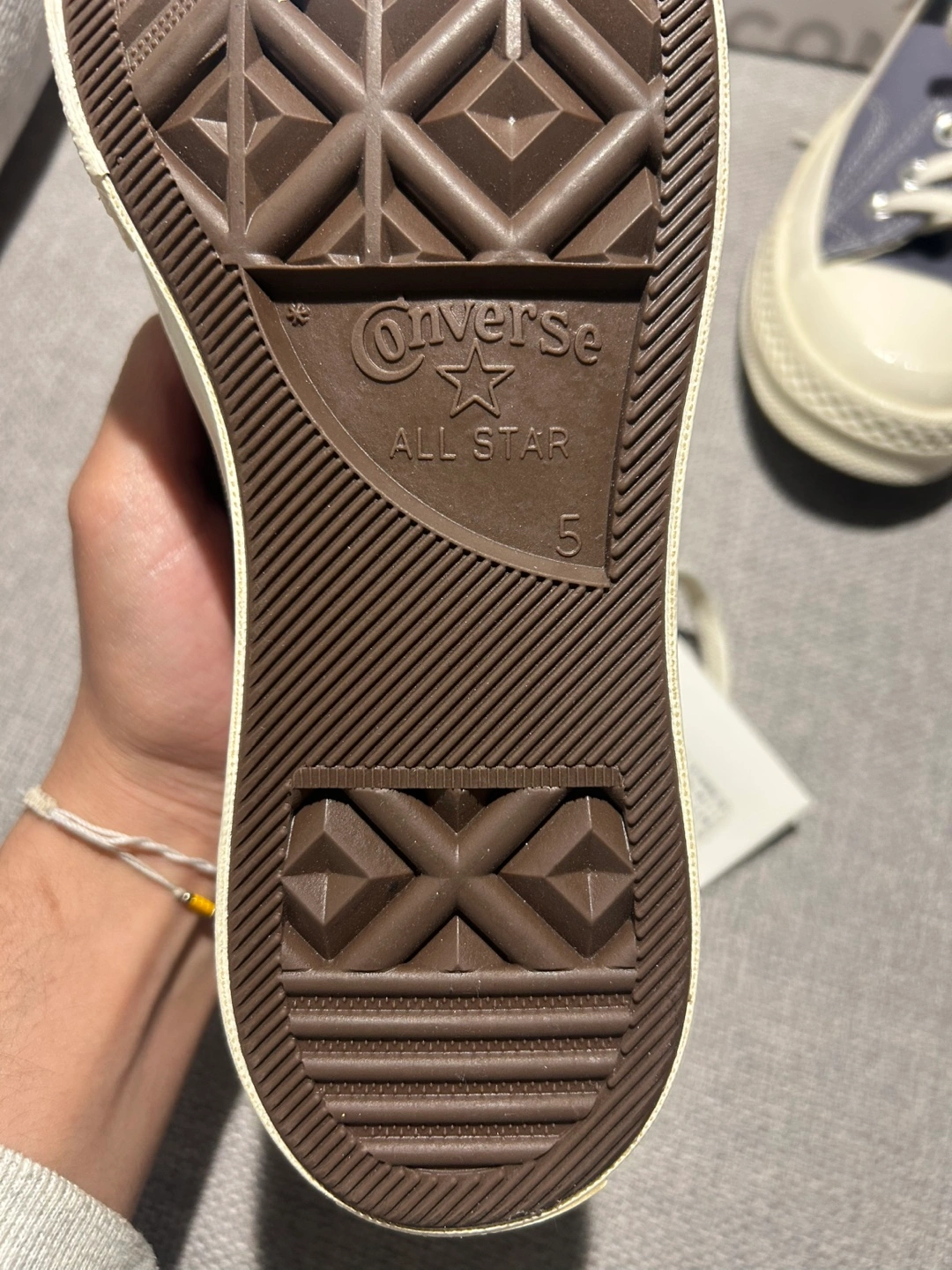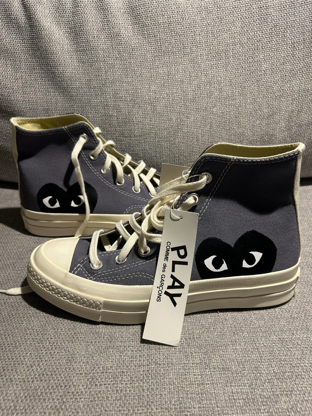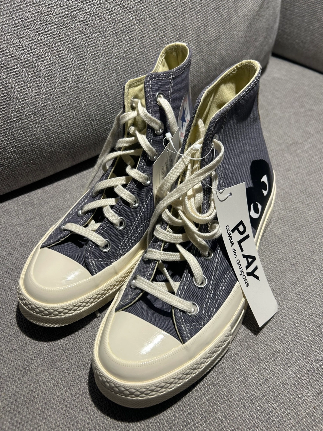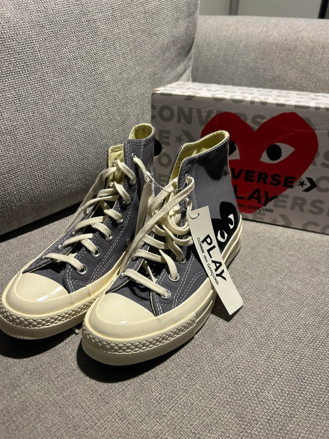 Grey high-top canvas sneakers. Comme des Garçons PLAY heart logo. Converse All Star branding. Brand new with box and tags.