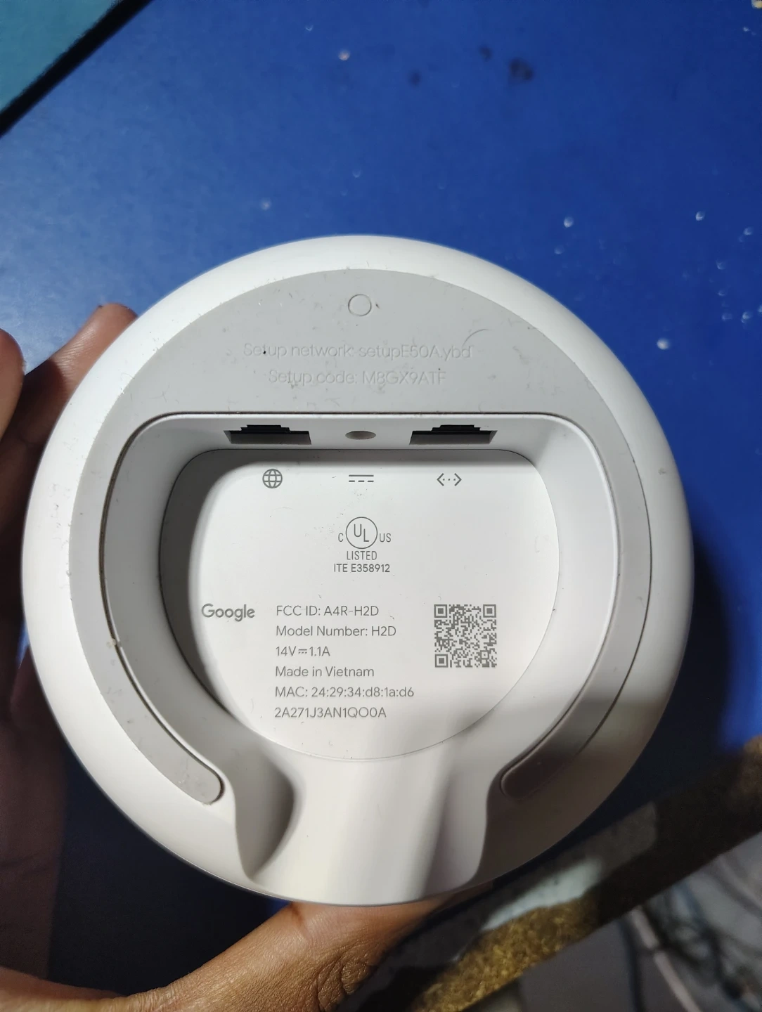 This is a Google Wifi router, model H2D. It's white and includes two Ethernet ports. This device is used for setting up a home network. I have 2 of these and 60 each