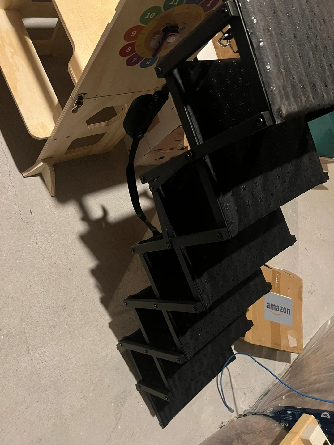 Black 4-tier collapsible pet stairs. It's made with durable material and folds down for easy storage. These stairs are great for helping pets reach higher places. It has a sturdy frame that provides stability.