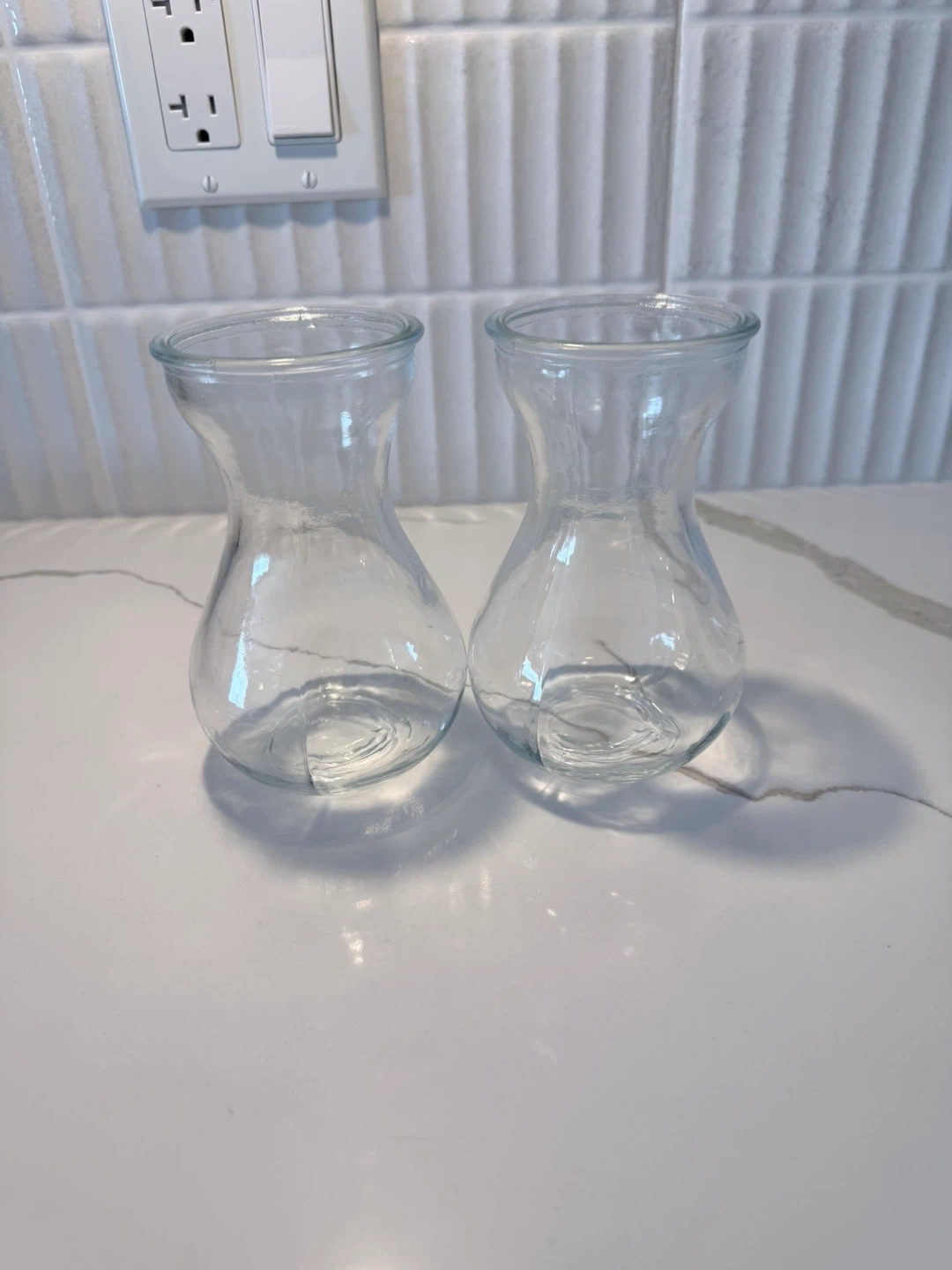 These are two clear glass vases. They're perfect for small floral arrangements or as decorative accents. Glass material.
