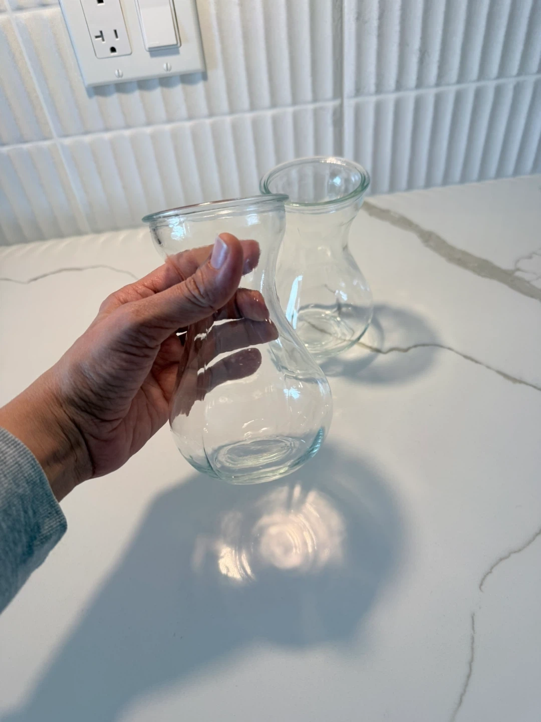 These are two clear glass vases. They're perfect for small floral arrangements or as decorative accents. Glass material.