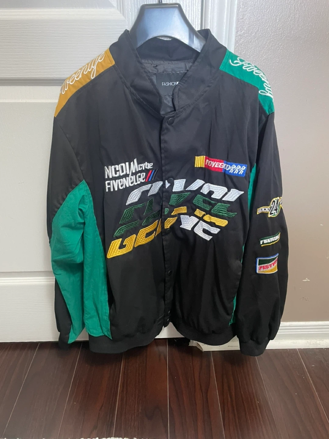 75Selling a unisex size small to medium fit racing jacket. It's black with green, yellow, and white accents. The jacket features various racing-themed patches and logos and side pockets. It's ready for a new home! Sfpfh. Ajax. Rossland and Salem area