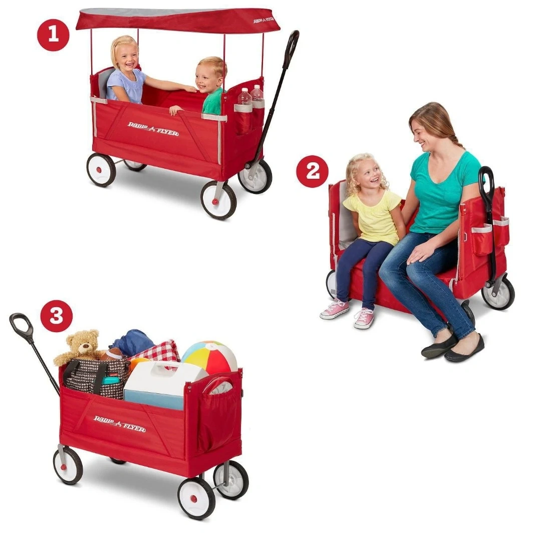 5This Radio Flyer Convertible Wagon is perfect for family outings! It easily folds for storage and transportation while featuring buckle seating, a removable top, an adjustable handle, and ample storage space for all your essentials. Great for trips to the park, beach, or zoo!